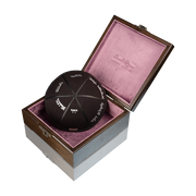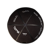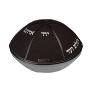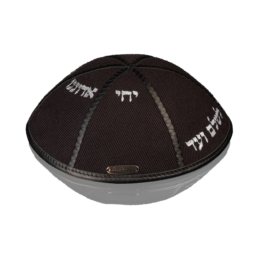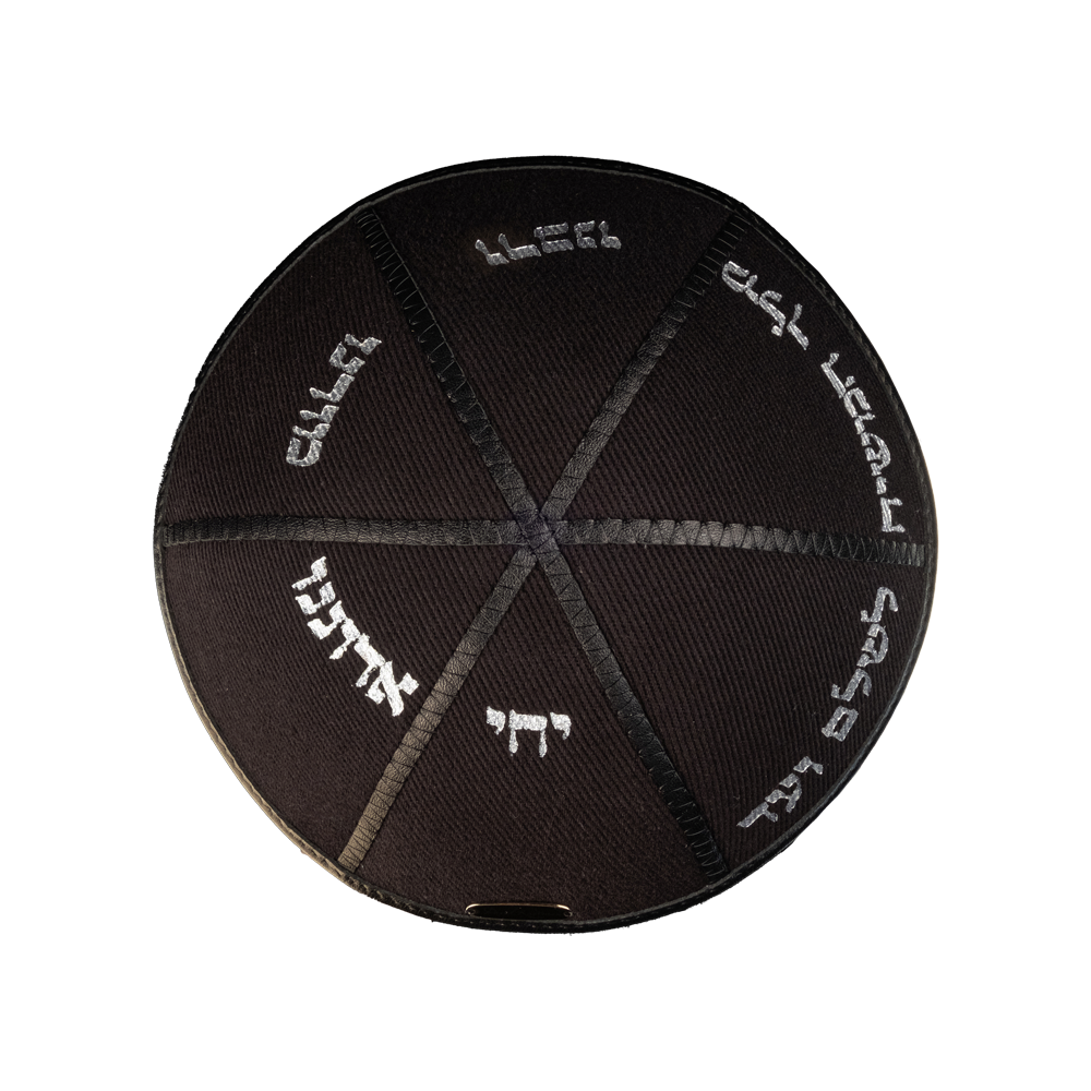 The “770” denim art kippah with acrylic painted Hebrew alphabet letters by David Roytman Luxury Judaica is a unique head covering that combines tradition and modern style.