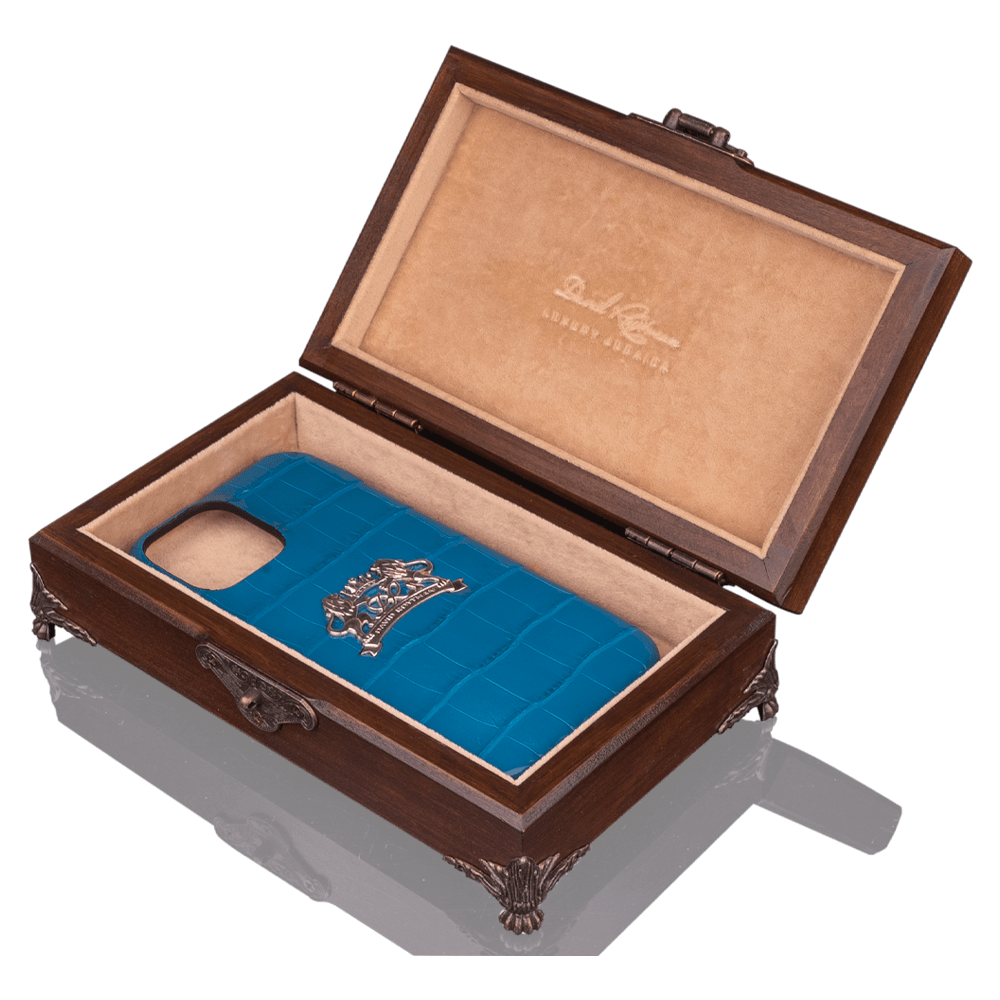 David Roytman Luxury Judaica brings you the exclusive Crocodile Leather Case for iPhone 16 Pro max in blue with lion nameplate, the epitome of luxury, style, and elegance.