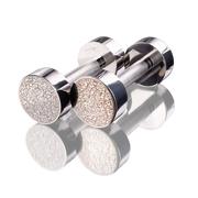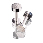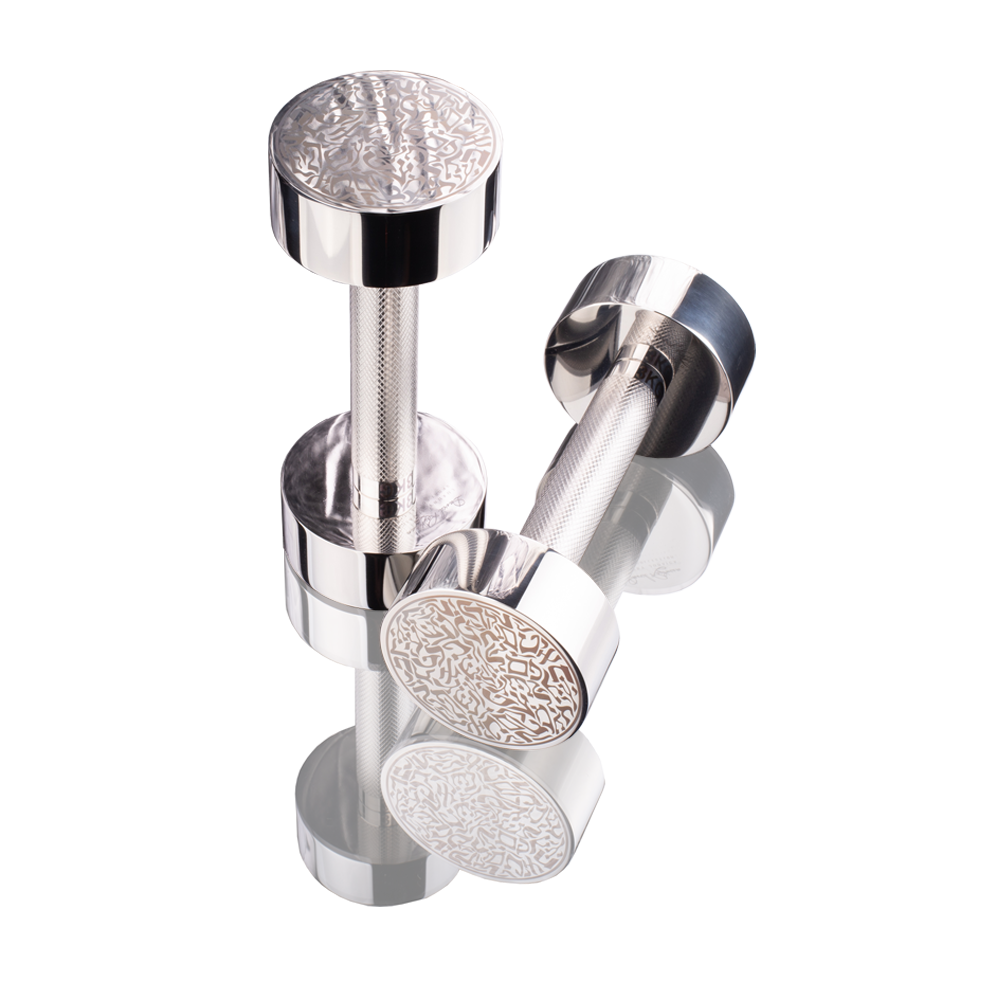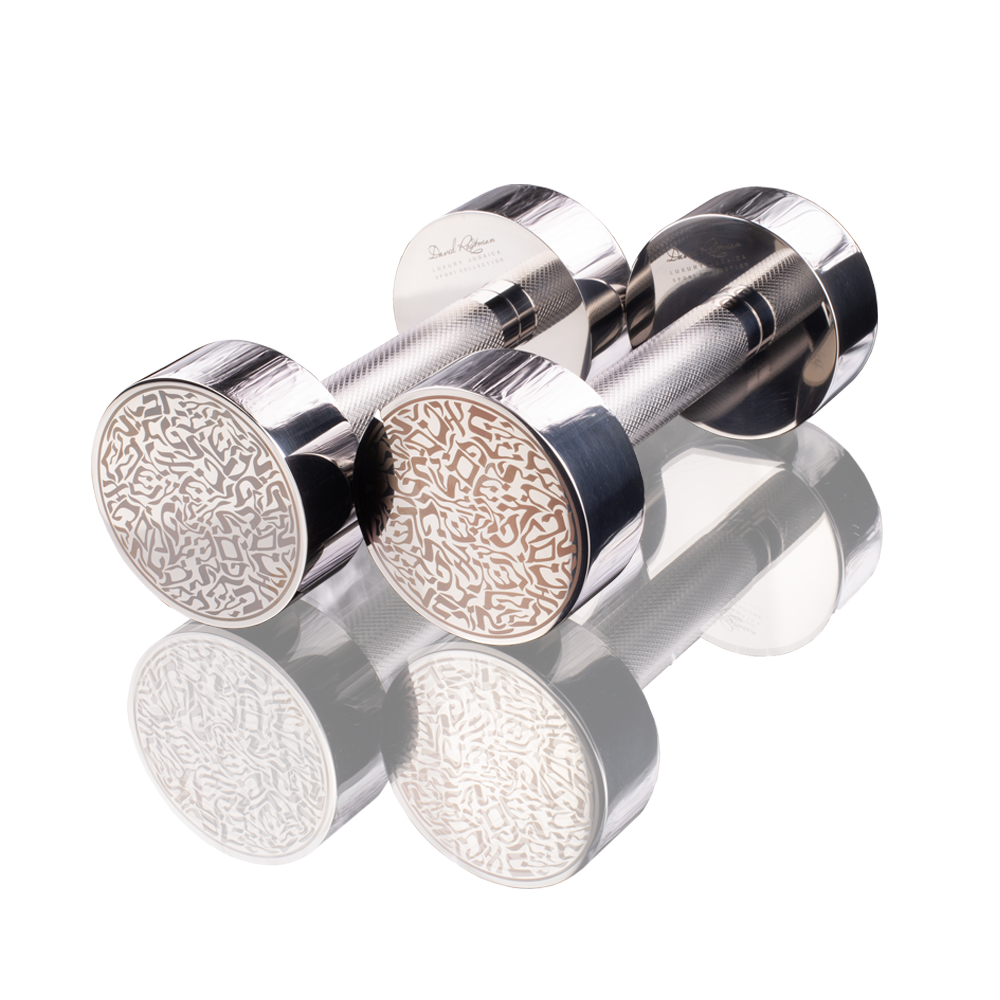 David Roytman brand dumbbells weighing 3 kg are made of chrome-plated steel. Each one is laser engraved with a pattern.