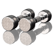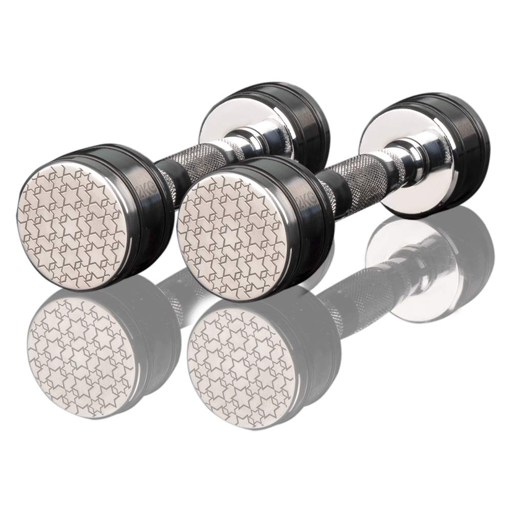 David Roytman brand dumbbells weighing 2 kg are made of chrome-plated steel. Each one is laser engraved with a pattern.