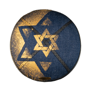 Baby's children's kippah is made of denim. Calligraphy with the Star of David is applied to the product with golden acrylic paints.