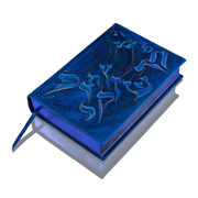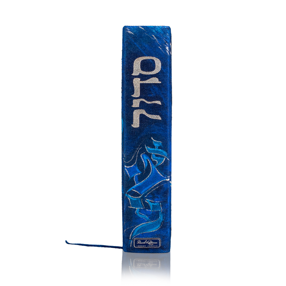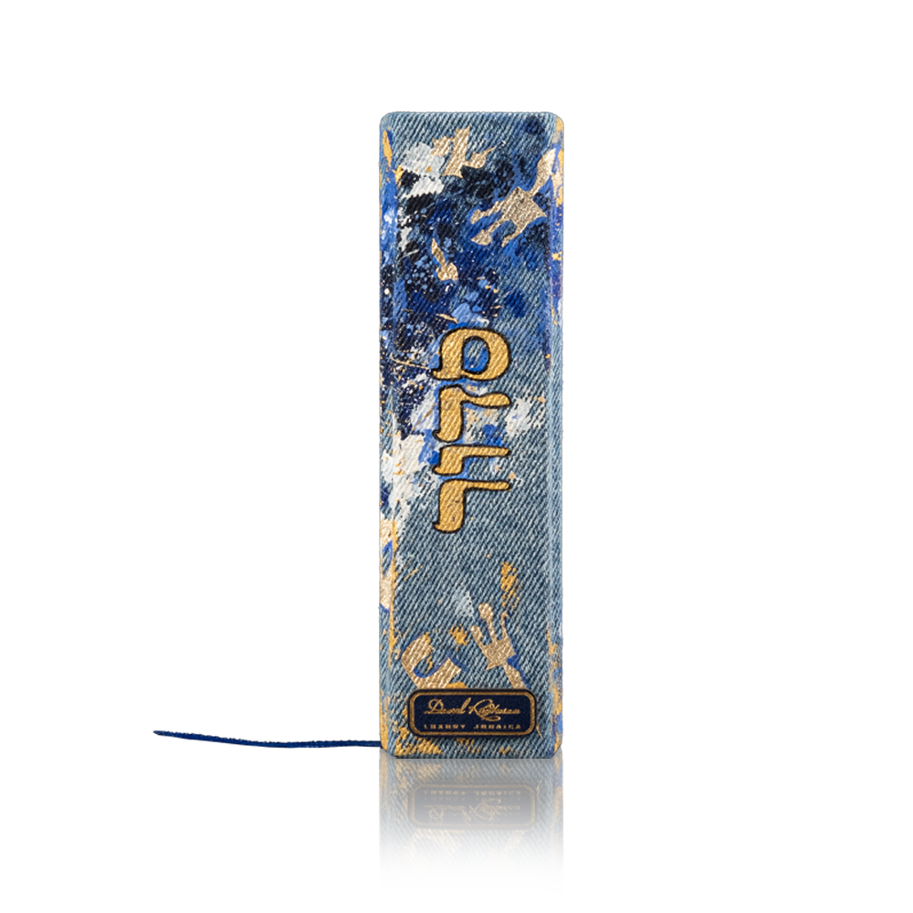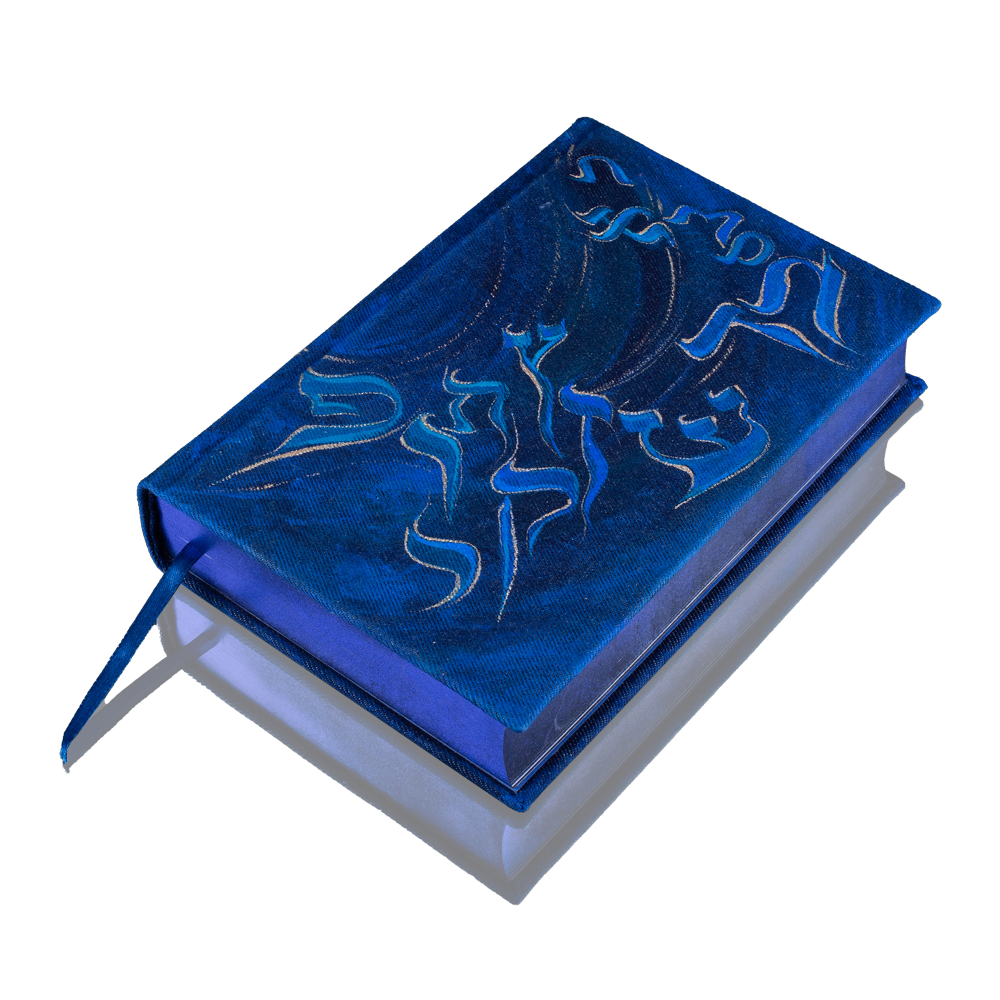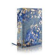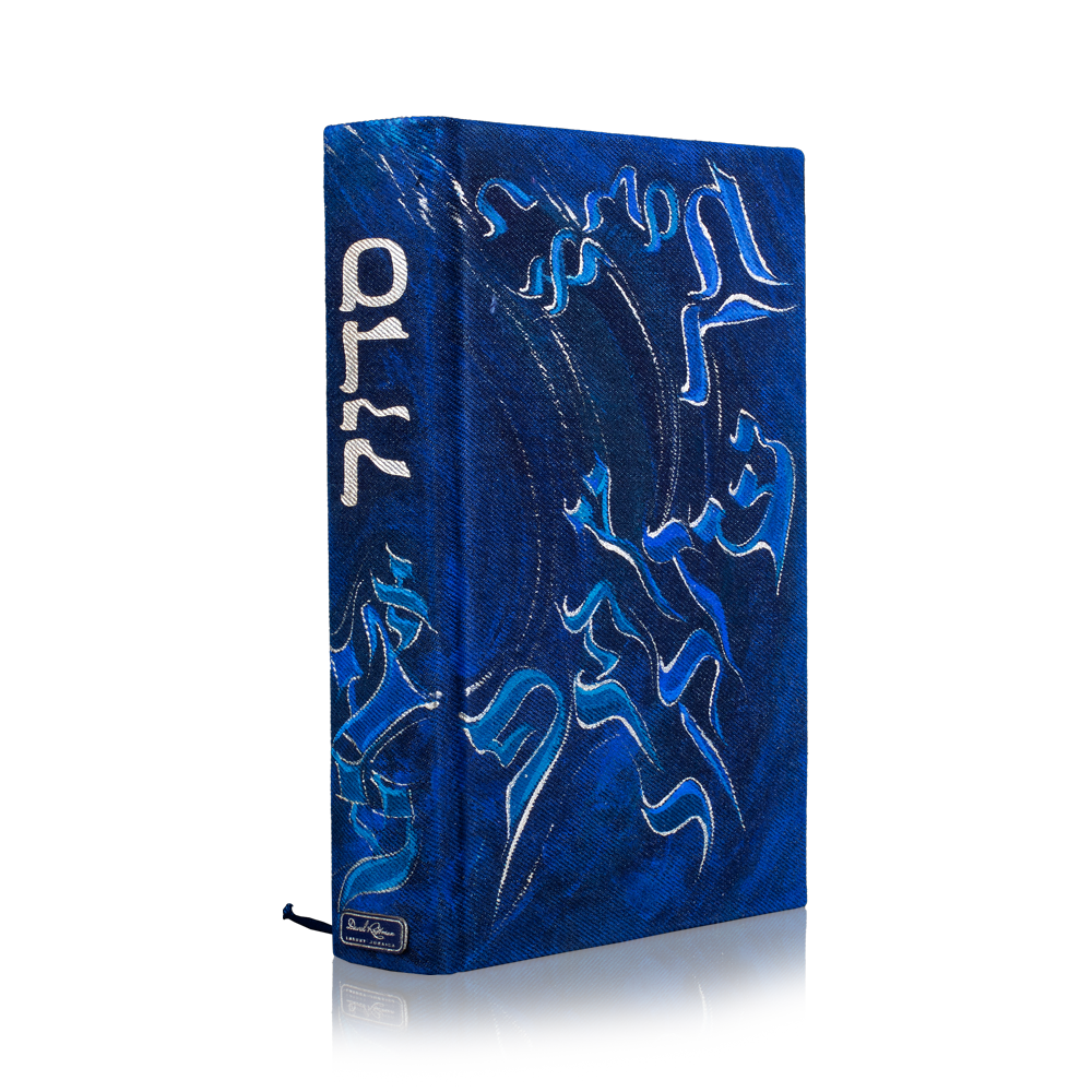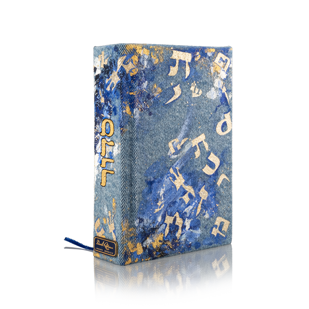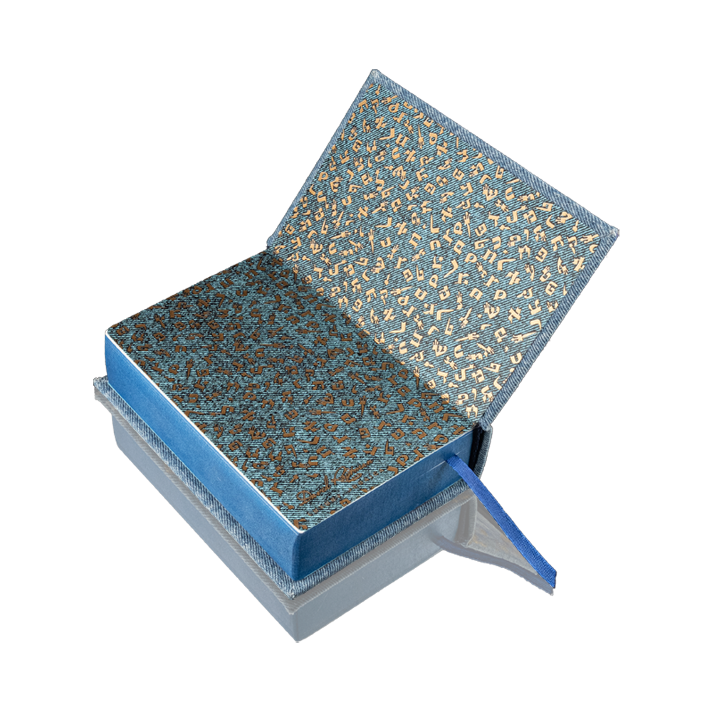 The book cover is made of high-quality denim and painted with acrylics, with Hebrew alphabet letters illustrated on the endpaper.