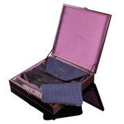 The bags are made of quality costume fabric in a noble blue colour. For edging, artisans used genuine Italian leather and suede. The classic chequered pattern made with laser engraving will remain relevant for years.