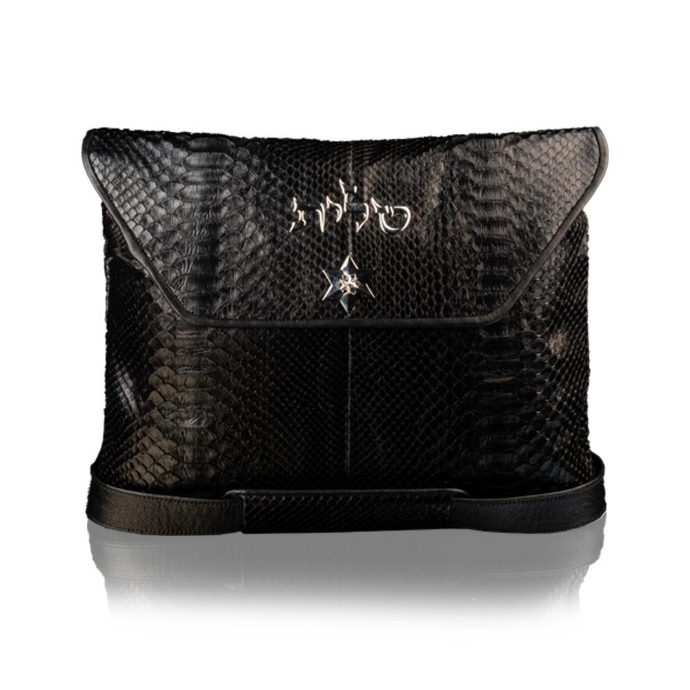 The noble roughness of python skin won’t stop to delight admirers of unusual, exotic accessories. The design house David Roytman Luxury Judaica, inspired by an exquisite, to some extent bold skin pattern, developed a unique set for Tallit and Tefillin made of black python leather.