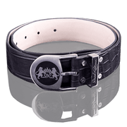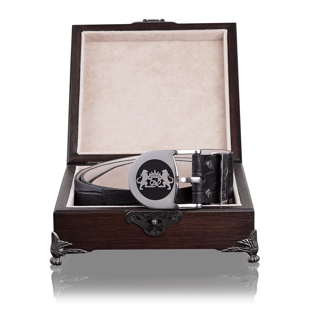 Strict classic belt is made of genuine crocodile leather. The buckle is cast from a composition of copper, nickel and zinc, which is called “new silver”. A layer of glossy black enamel and a silhouette of Jerusalem lions are applied on top.