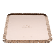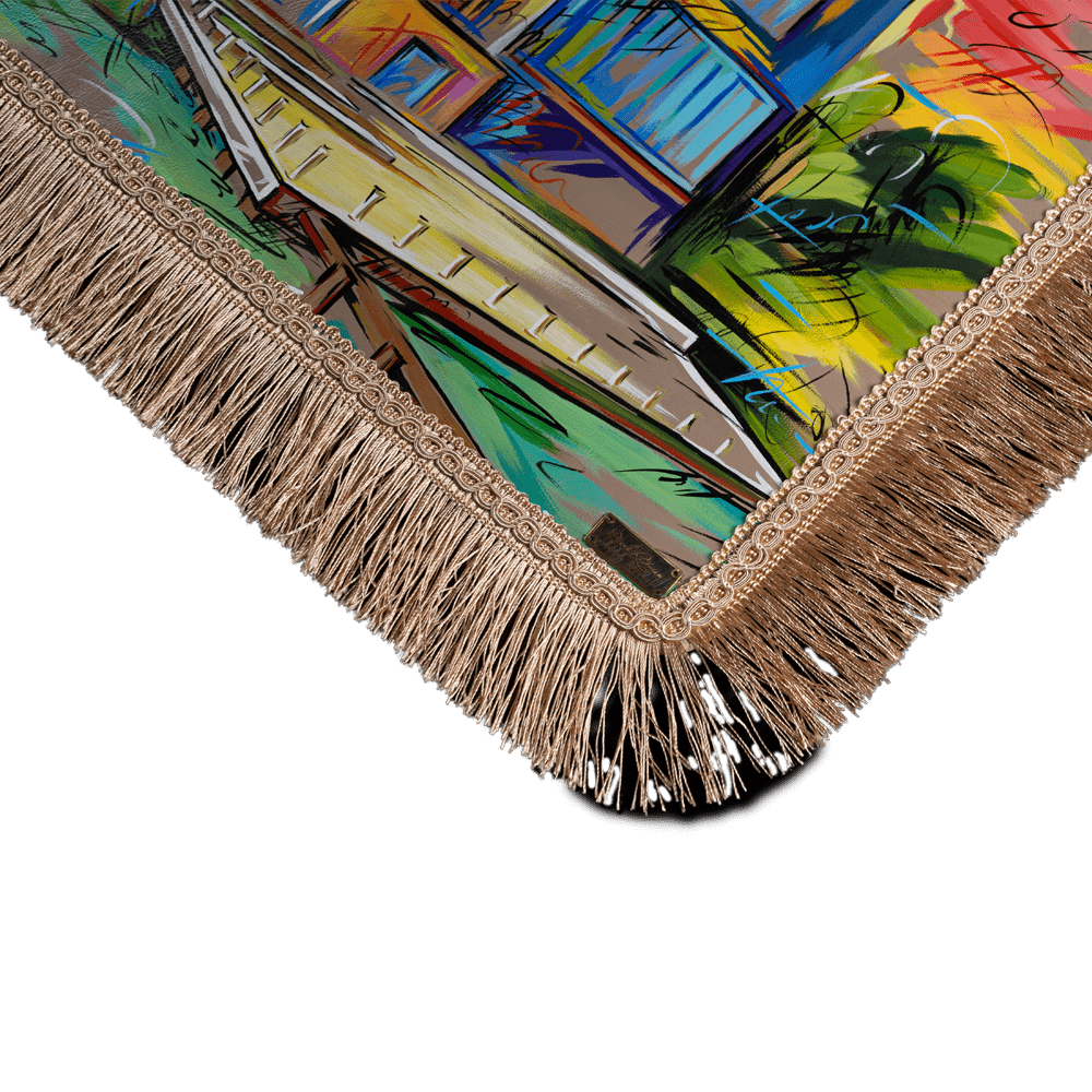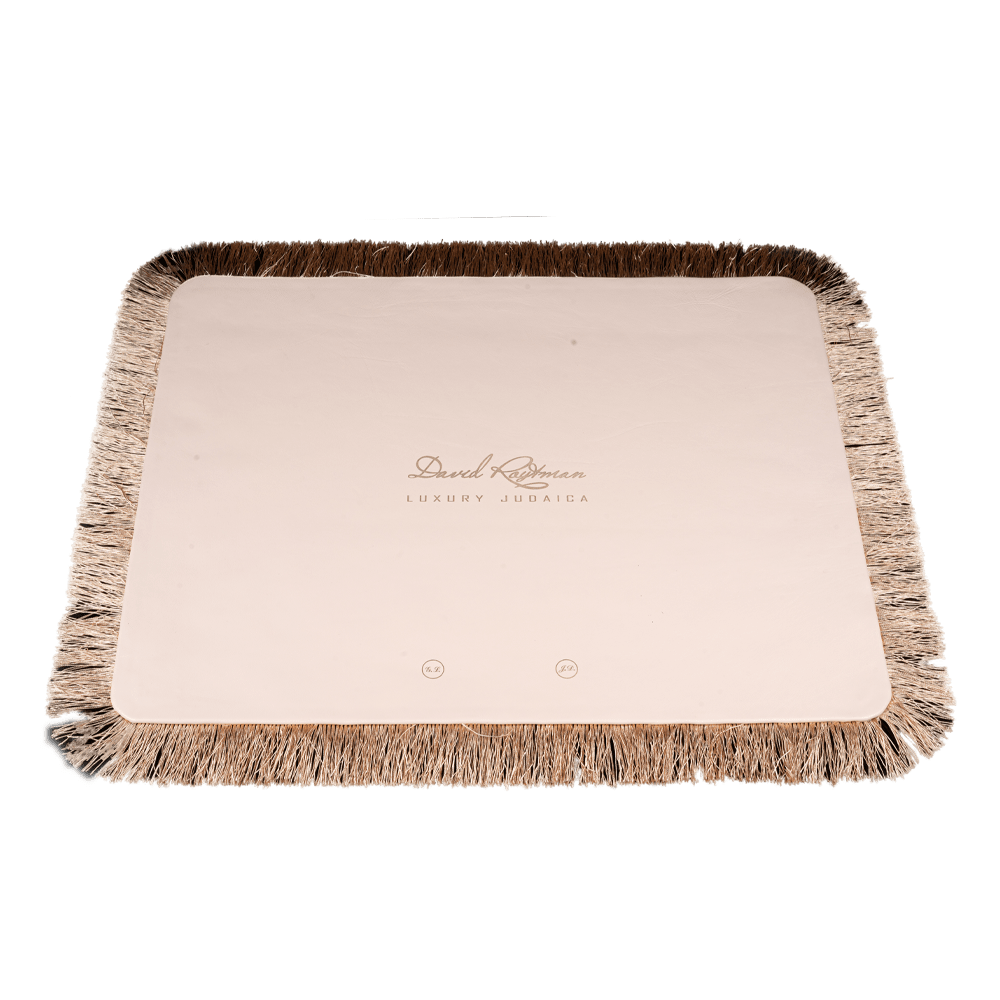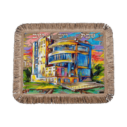 The elegant leather challah cover is made of genuine Italian leather and hand-painted with acrylic colors. The design depicts the historic synagogue located in the South Miami Beach neighborhood of Miami Beach, Florida. The edges of the robe are decorated with lush fringe.
