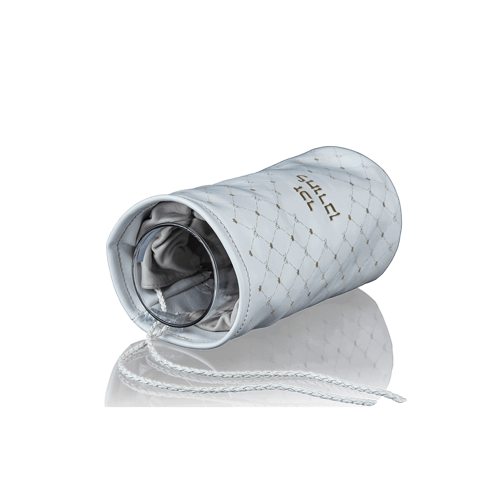 The product is made of genuine Italian leather in warm white color. The traditional calligraphy is dedicated to the destroyed temple. Together with the brand's signature pattern, it is applied by hand using laser engraving.