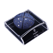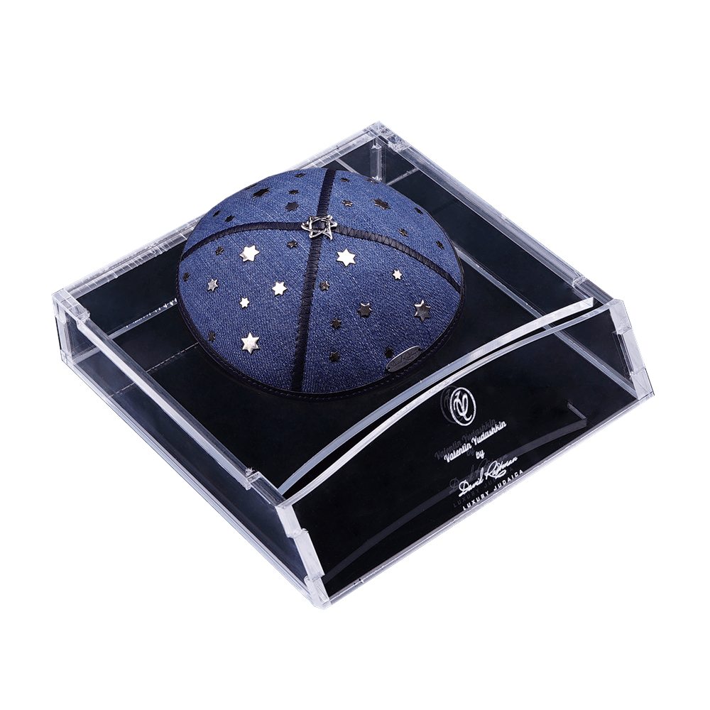 The kippahs designed by Valentin Yudashkin and David Roytman are a graceful blend of casual style and traditional Judaica. The "Classic" kippah is made of Valentin Yudashkin's signature solid denim. The Stars of David, Israel's national and cultural symbol, are cast in sterling silver. The small oval medallion is engraved with the David Roytman logo.