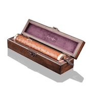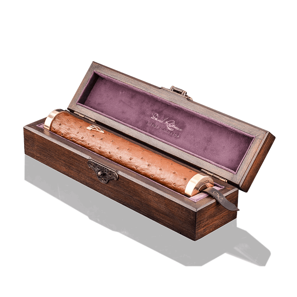The case is made of bronze and ostrich skin. Thanks to the modern technology of painting, masters managed to achieve warm brown shade without losing at the same time the natural texture of the material. The traditional Hebrew letter “Shin” protects the sacred scroll. It refers to one of God's names, Shadai, and means “the fire of God that devours all his enemies.” David Roytman's signature wooden case, upholstered with velvet on the inside, comes with a product.