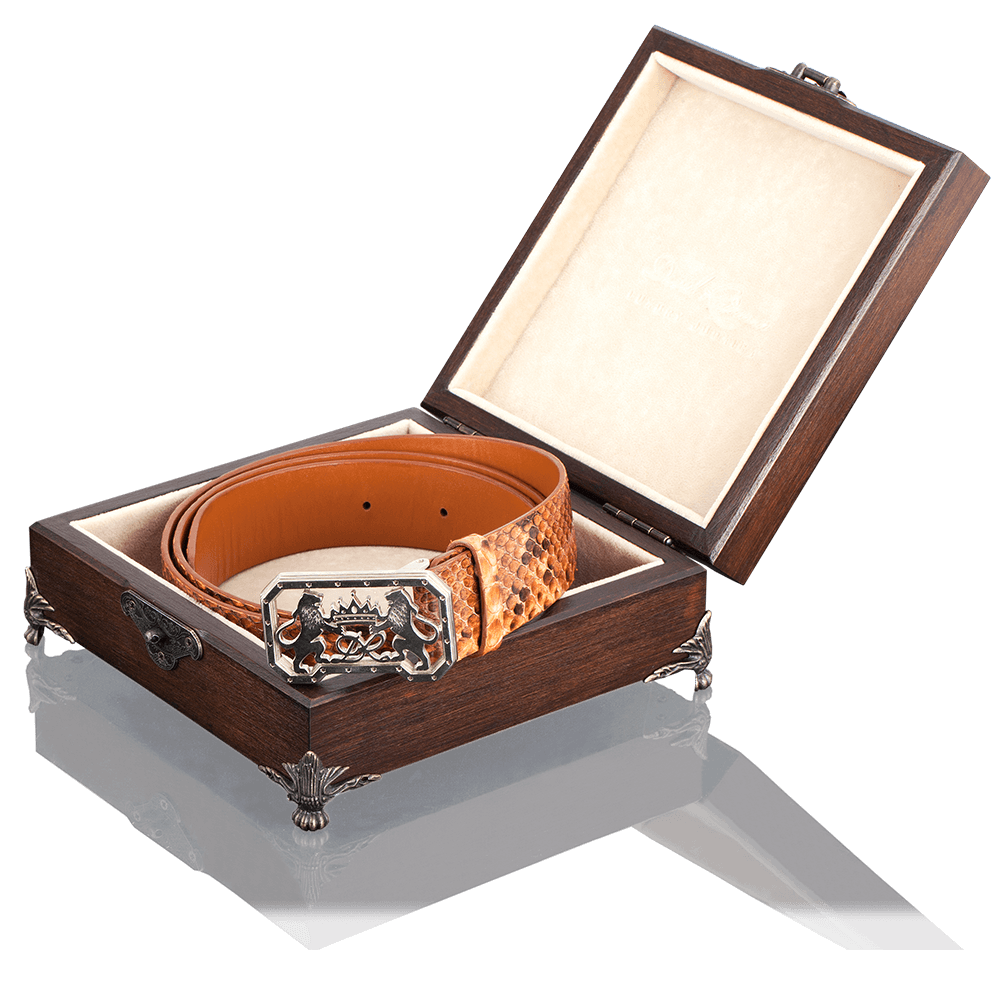 Strict classic belt is made of genuine python leather. The buckle is cast from a composition of copper, nickel and zinc, which is called “new silver”. A layer of glossy black enamel and the silhouette of Jerusalem lions is applied on top.