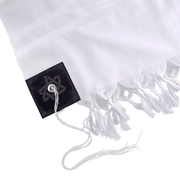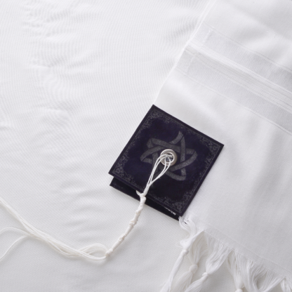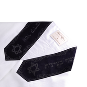 Laconic, restrained design is the hallmark of the classic collection. The tallit is made of natural woollen fabric. The corner of the piece features a suede insert for tzitzit with an ornament and a curved Star of David, whose exclusive design was developed by David Roytman. The embossing is laser-engraved, and the tzitzit is hand-woven by artisans from a natural thread.