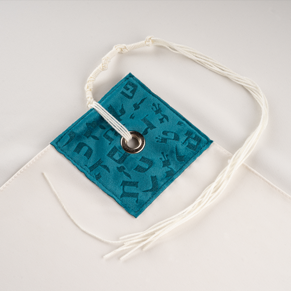Laconic, restrained design is the hallmark of the classic collection. The tallit is made of natural woollen fabric. The corner of the piece features a suede insert for tzitzit with an ornament and a curved Star of David, whose exclusive design was developed by David Roytman. The embossing is laser-engraved, and the tzitzit is hand-woven by artisans from a natural thread