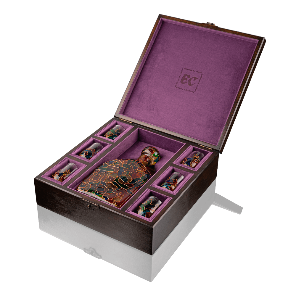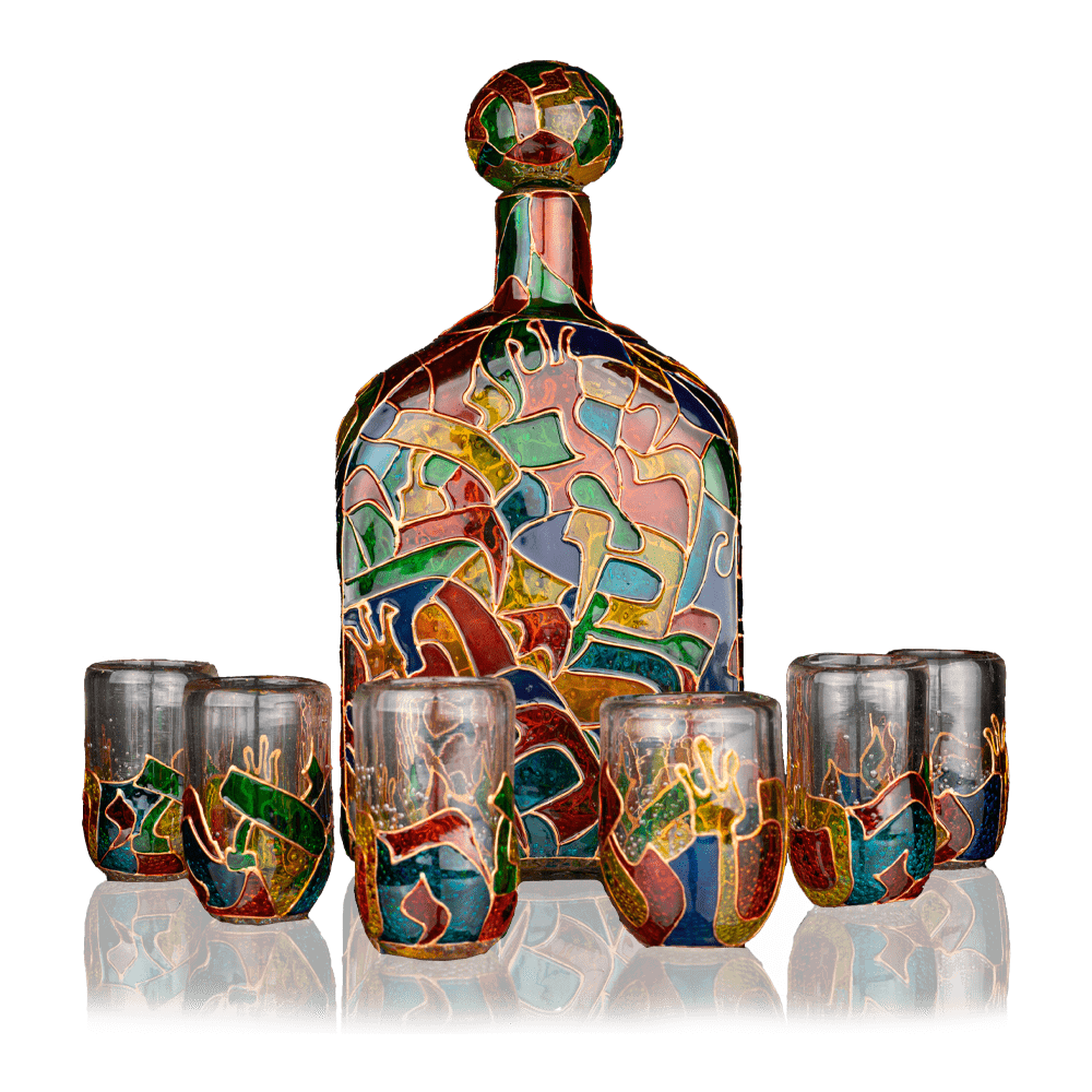 We present to your attention a unique set consisting of a decanter and shot glasses, handmade with hand-painted patterns of letters of the Hebrew alphabet from the David Roytman Luxury Judaica design house. This set not only serves as a practical element of table setting, but is also a true work of art, embodying the richness of cultural heritage and spirituality.