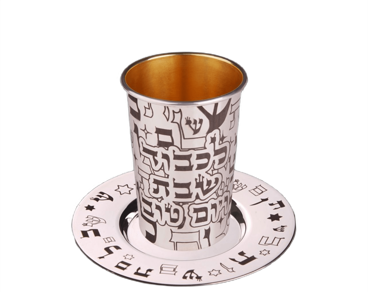 Becher (kiddush cup) and saucer for kiddush "Letters of the Hebrew alphabet" made of silver