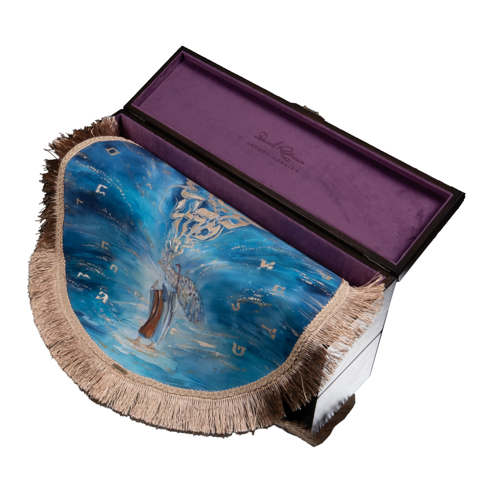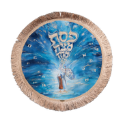 The cover features a hand-painted acrylic artwork depicting Moses leading the people of Israel. The composition is enriched with golden Hebrew letters, adding depth and symbolic meaning to the piece.