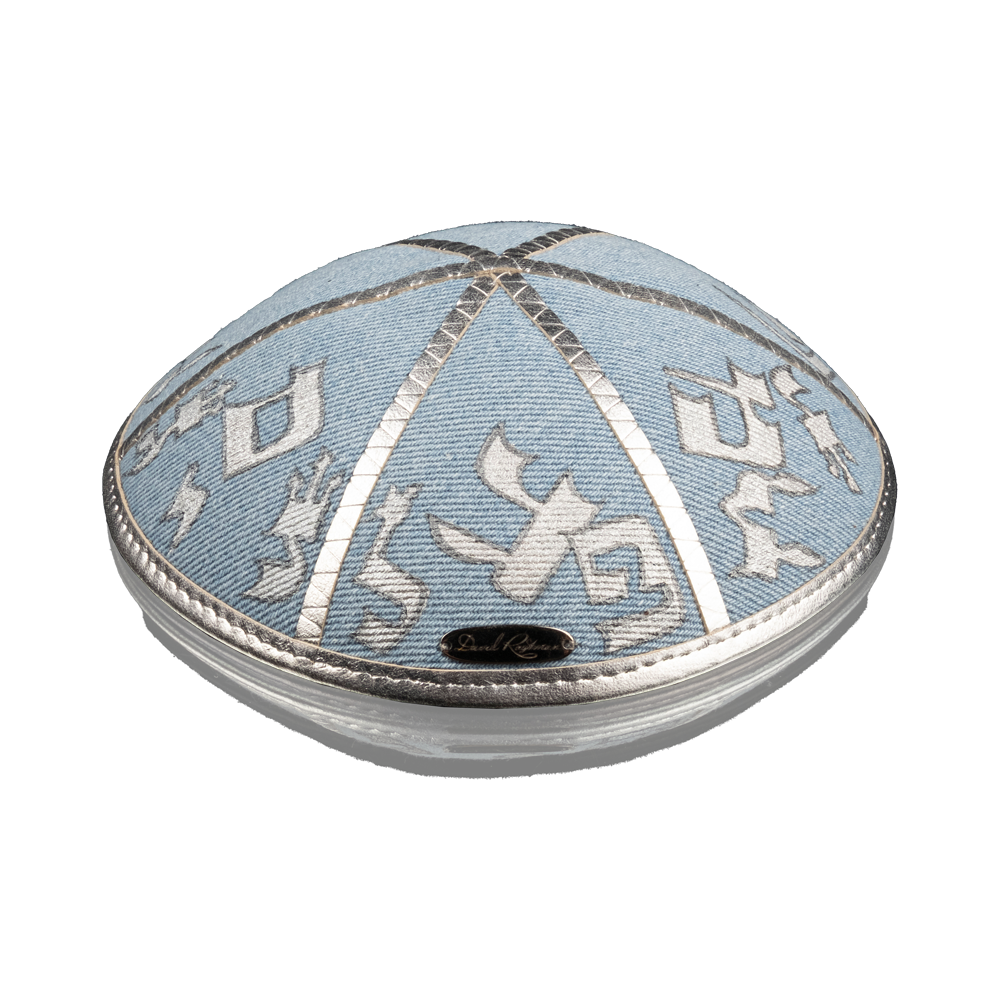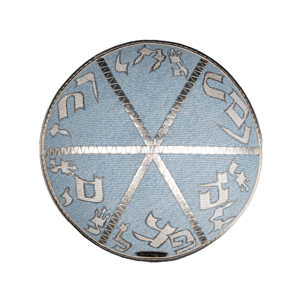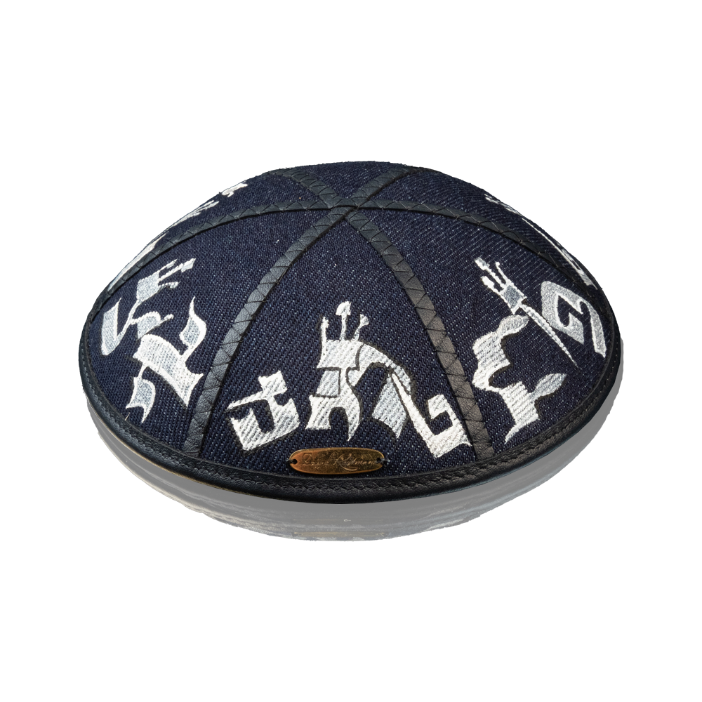 Kippah "Modern" with art  "Letters of the Hebrew alphabet" made of denim by David Roytman Luxury Judaica is a unique piece that combines style and deep Jewish tradition. Crafted from durable denim of the highest quality, this kippah is decorated with the letters of the Hebrew alphabet, giving it a special symbolic meaning.