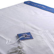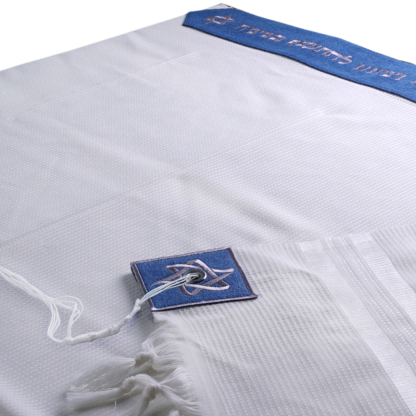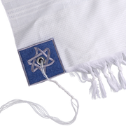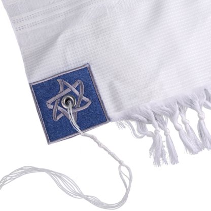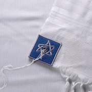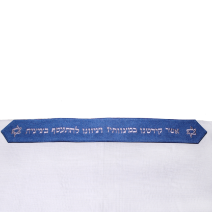Tallit is one of the traditional prayer attributes of Jewish men. In ancient times, they wore this rectangular coverlet as a daily garment in the morning and used it as a blanket at night. Now men wear it during their daily morning prayers. On the edge of each tallit, it is customary to tie a tzitzit. This bundle of threads woven together is a reminder to keep the commandments. David Roytman's denim collection combines traditional motifs with a modern, bold design. The tallit is made of natural wool fabric. The corner of the piece features a black denim insert for tzitzit with an ornament and a curved Star of David, whose exclusive design was developed by David Roytman. The embossing is laser-engraved, and the tzitzit is hand-woven by artisans from a natural thread.