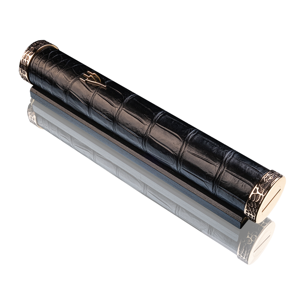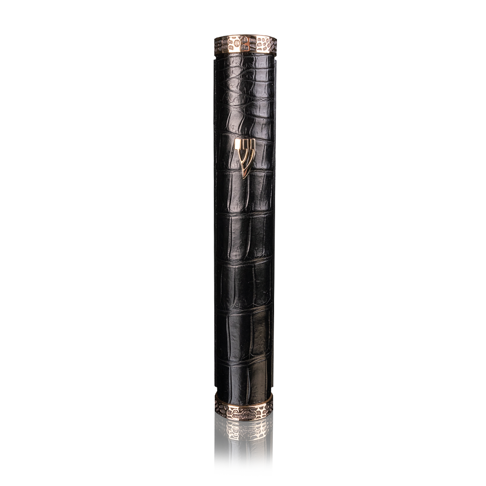The Jerusalem mezuzah case in crocodile leather with stone backing, created by the David Roytman Luxury Judaica design house, is the epitome of sophistication and tradition in Jewish religious symbolism.