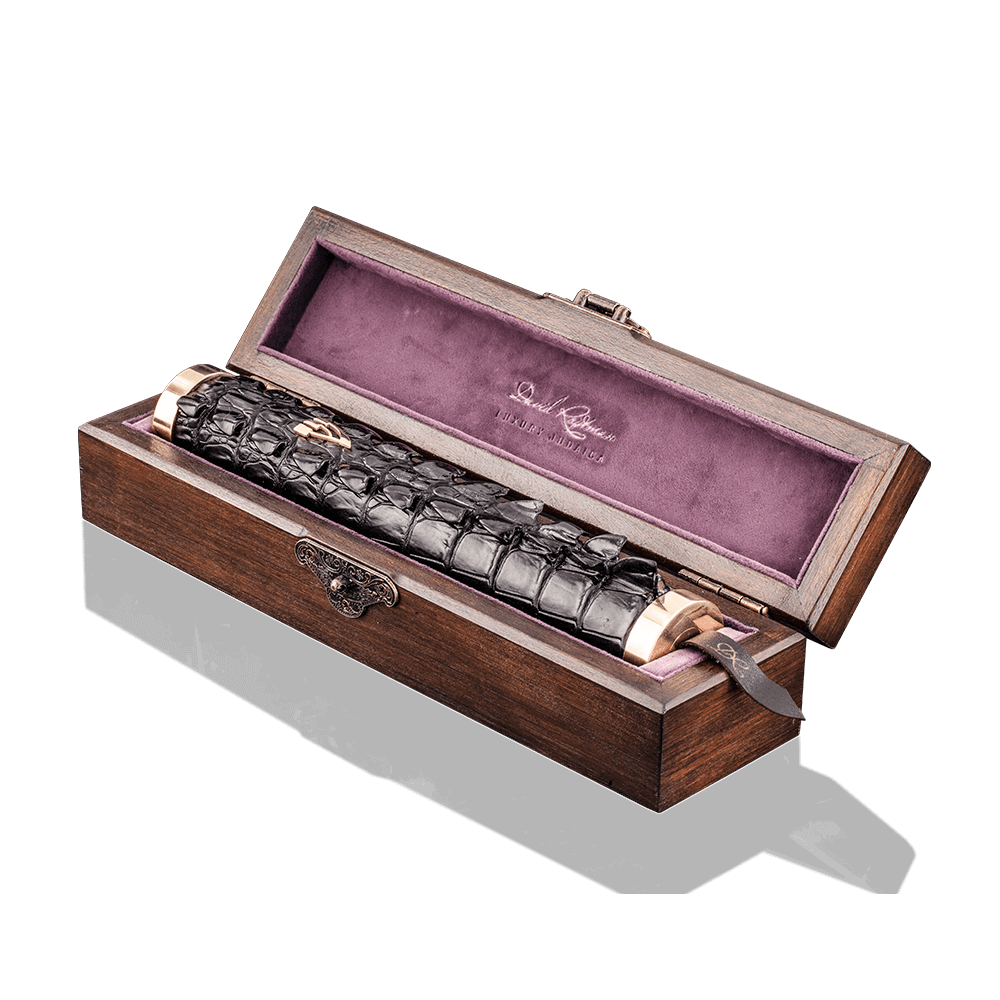 The case is made of caiman leather. The traditional Hebrew letter “Shin” protects the sacred scroll. It refers to one of God's names, Shadai, and means “the fire of God that devours all his enemies.