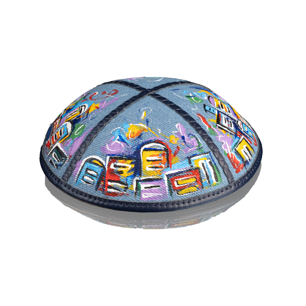The 'Jerusalem Art' denim kippah from the David Roytman Luxury Judaica design house is a unique headpiece inspired by the grandeur and spirituality of the holy city of Jerusalem.