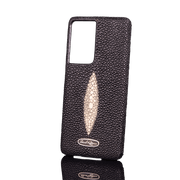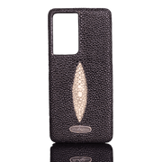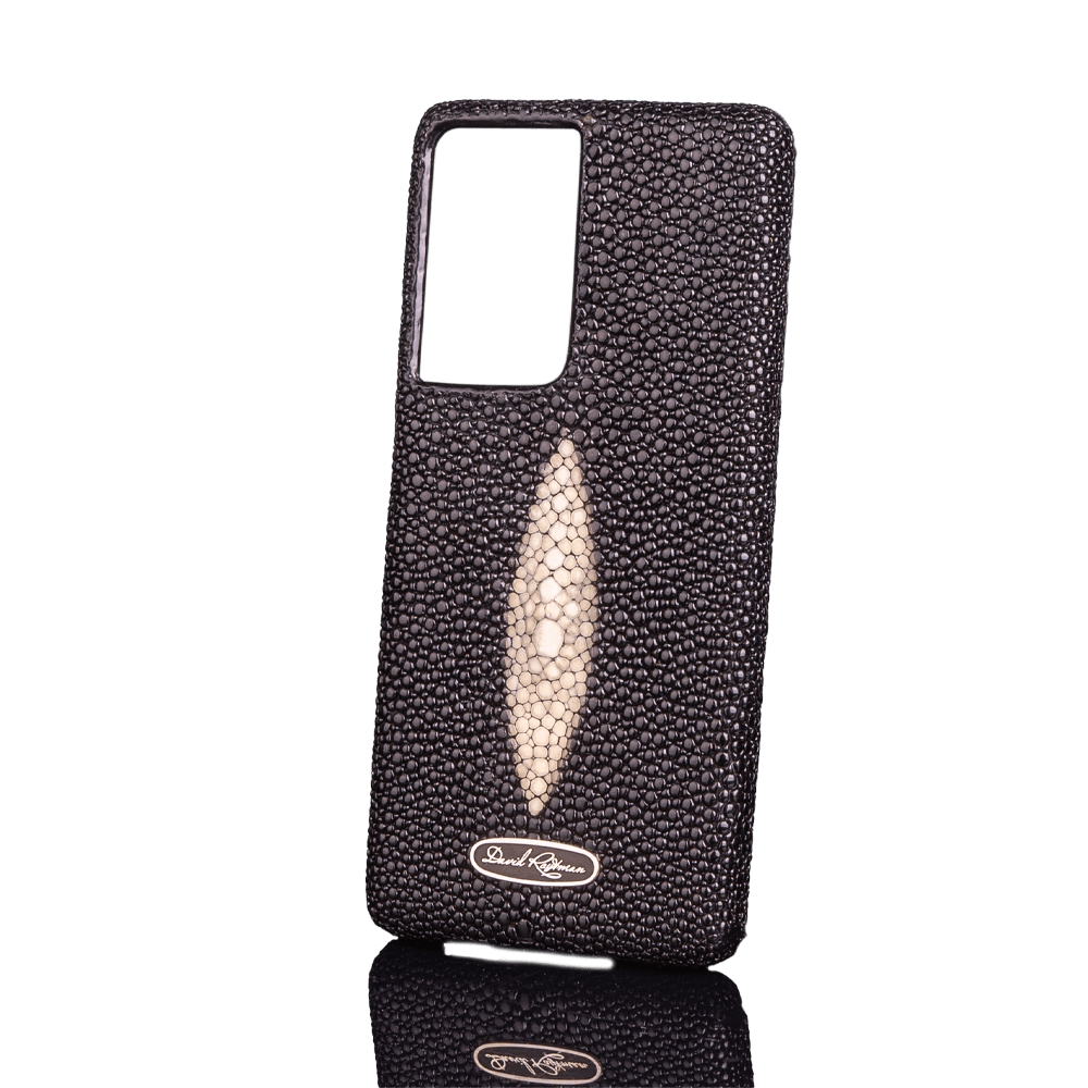 A black phone case from the designer house David Roytman Luxury Judaica, featuring stingray leather accents and a stylish metal badge, is a perfect blend of elegance and sophistication, giving your smartphone an exclusive look
