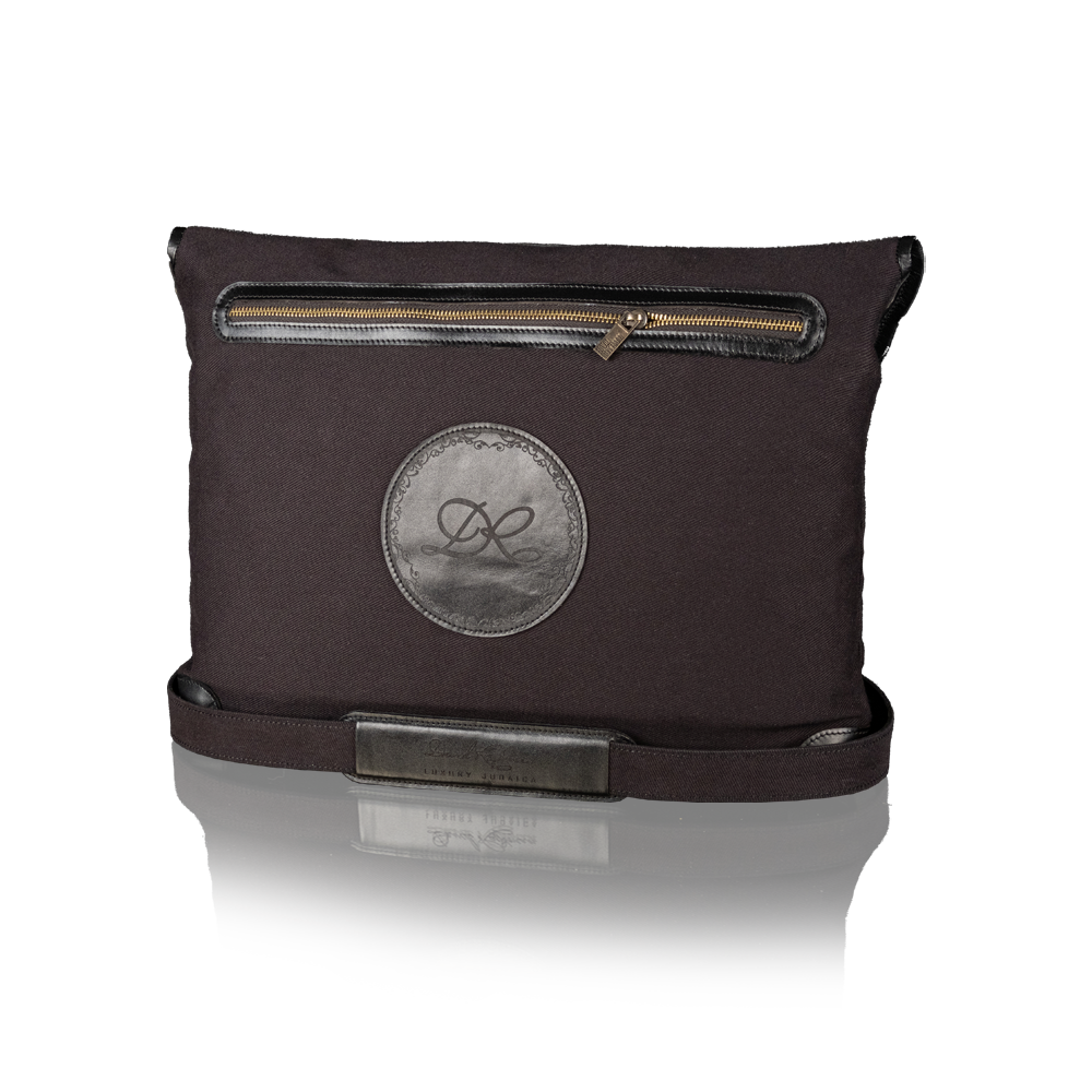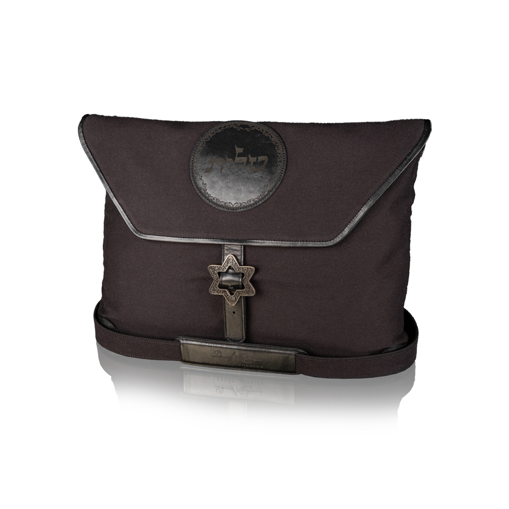 The tallit and tefillin bags are made of denim and genuine Italian leather and laser engraved with the brand's signature pattern.