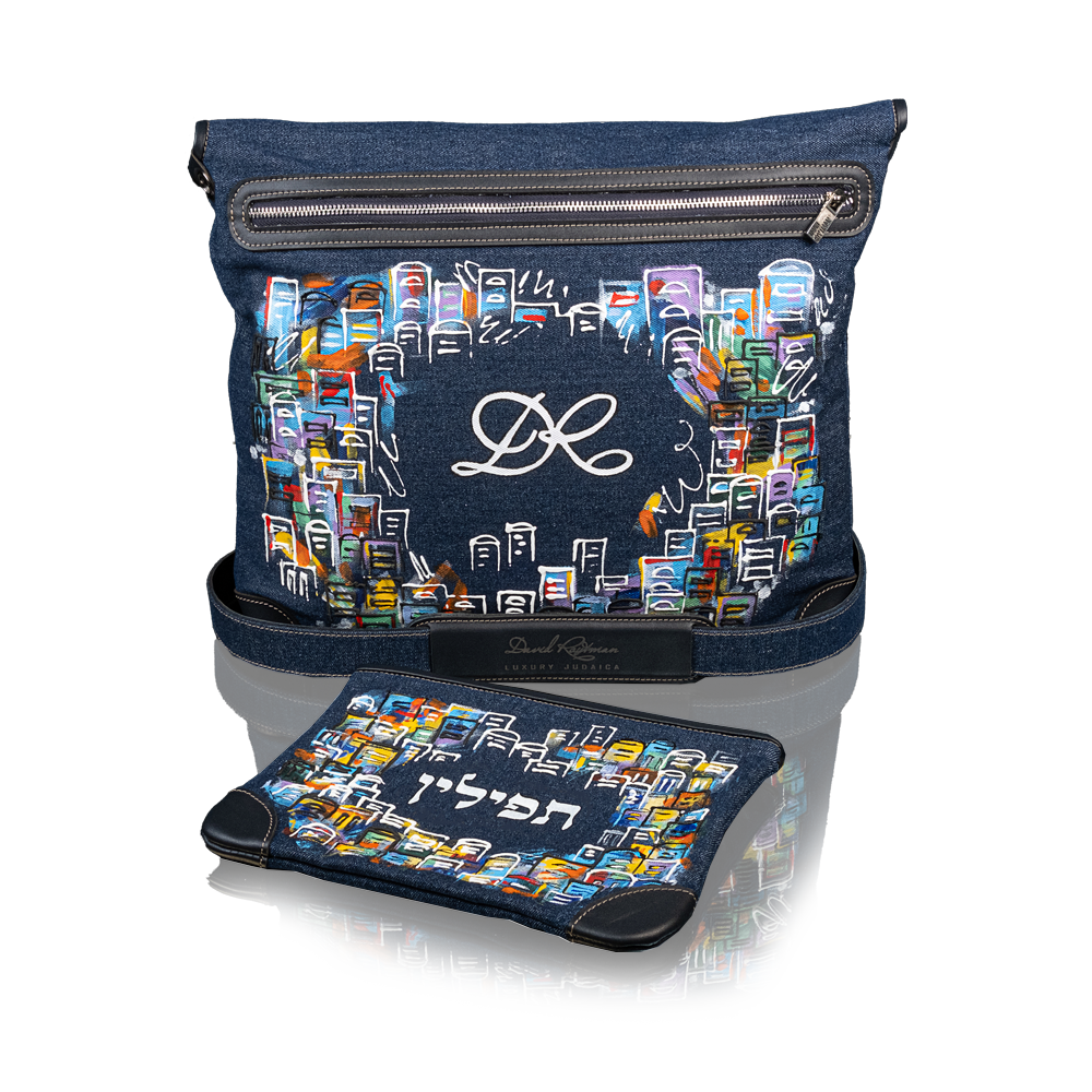 Introducing the exquisite Tzfat tallit and tefillin set from the Denim Art Collection by David Roytman luxury Judaica design house, inspired by the beauty and spirit of Jewish cities. This set not only symbolizes your dedication to tradition, but is also a true work of art.