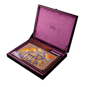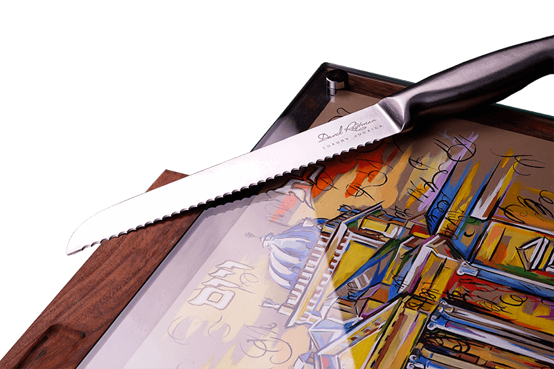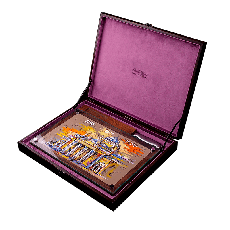 The set includes a challah cutting board and knife. Artisans combined dark ash and walnut for the board. Beneath the sturdy glass layer is a painting made with acrylic paints. Artists made it by hand, on top of the natural Italian leather.
