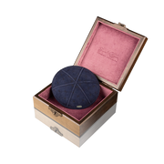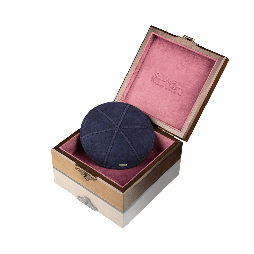 Handcrafted by artisans from the David Roytman Luxury Judaica Design House, the 'Modern' kippah is a sophisticated accessory that combines contemporary style with refined details, giving a traditional piece of clothing a distinctive character. The suede contrasts with the trim in the tone of the piece, creating a textured look.