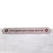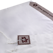 The tallit is made of natural wool fabric. The corner of the piece features a black denim insert for tzitzit with an ornament and a curved Star of David, whose exclusive design was developed by David Roytman. The embossing is laser-engraved, and the tzitzit is hand-woven by artisans from a natural thread.