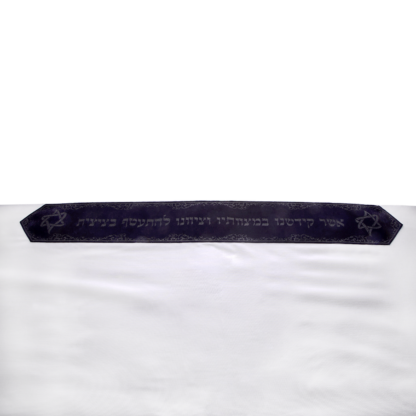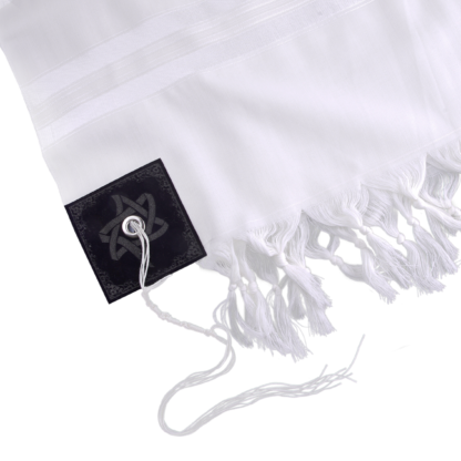 Laconic, restrained design is the hallmark of the classic collection. The tallit is made of natural woollen fabric. The corner of the piece features a suede insert for tzitzit with an ornament and a curved Star of David, whose exclusive design was developed by David Roytman. The embossing is laser-engraved, and the tzitzit is hand-woven by artisans from a natural thread.