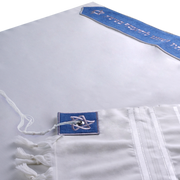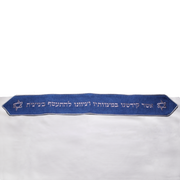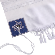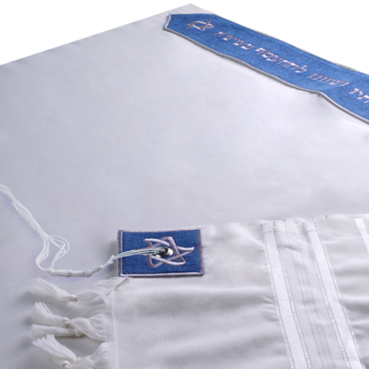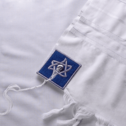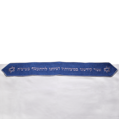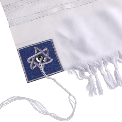 Tallit is one of the traditional prayer attributes of Jewish men. In ancient times, they wore this rectangular coverlet as a daily garment in the morning and used it as a blanket at night. Now men wear it during their daily morning prayers. On the edge of each tallit, it is customary to tie a tzitzit. This bundle of threads woven together is a reminder to keep the commandments. David Roytman's denim collection combines traditional motifs with a modern, bold design. The tallit is made of natural wool fabric. The corner of the piece features a black denim insert for tzitzit with an ornament and a curved Star of David, whose exclusive design was developed by David Roytman. The embossing is laser-engraved, and the tzitzit is hand-woven by artisans from a natural thread.