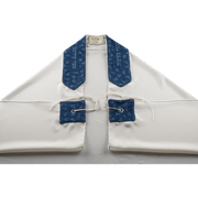 The tallit is made of natural woollen fabric. The corner of the piece is decorated with a black denim tzitzit insert, over which a curved Star of David is embroidered, framed by a laconic border - its exclusive design was developed by David Roytman. The natural thread tzitzit is hand woven by the designer's artisans.