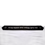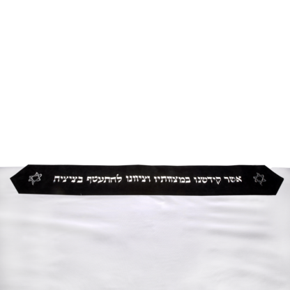 The tallit is made of natural woollen fabric. The corner of the piece features a suede insert for tzitzit with an ornament and a curved Star of David, whose exclusive design was developed by David Roytman. The embossing is laser-engraved, and the tzitzit is hand-woven by artisans from a natural thread.