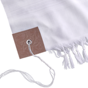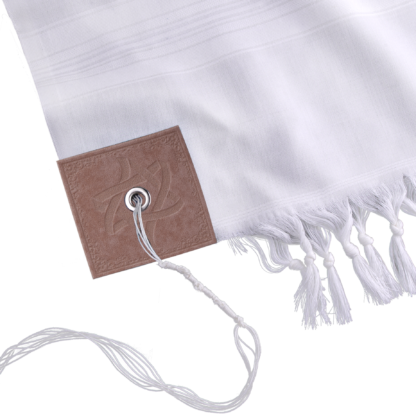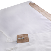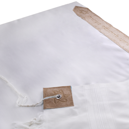 Laconic, restrained design is the hallmark of the classic collection. The tallit is made of natural woollen fabric. The corner of the piece features a suede insert for tzitzit with an ornament and a curved Star of David, whose exclusive design was developed by David Roytman. The embossing is laser-engraved, and the tzitzit is hand-woven by artisans from a natural thread.
