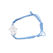The bracelet is made of smooth blue thread. The weaving is handmade by craftsmen. In the center is a star of David in white gold hamsa. The diameter of the bracelet is adjustable with a puff.”