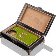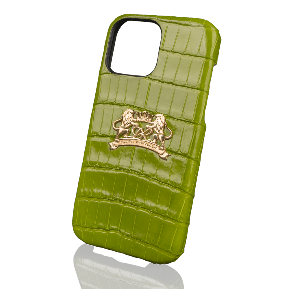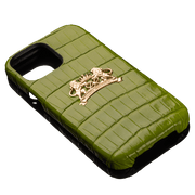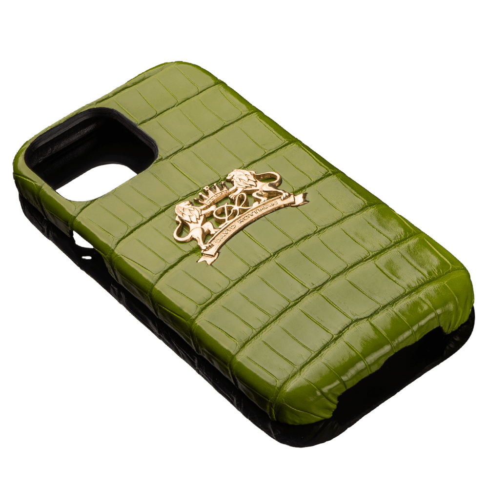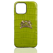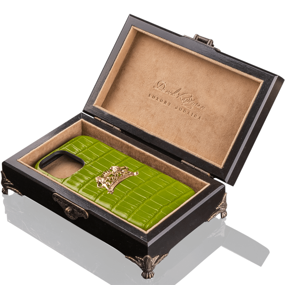 David Roytman Luxury Judaica brings you the exclusive Crocodile Leather Case for iPhone 16 Pro max in green with lion nameplate, the epitome of luxury, style, and elegance.