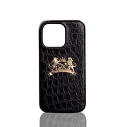 כיסוי עור תנין שחור לאייפון 16 פרו עם לוחית "האריות"