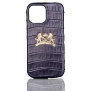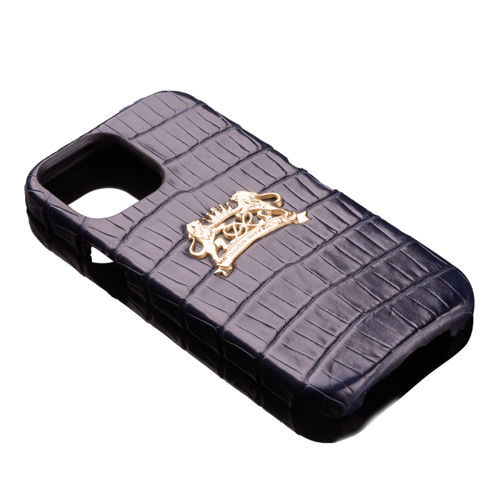 כיסוי לאייפון 16 פרו מקס מעור תנין כחול כהה עם לוחות אריות מפליז