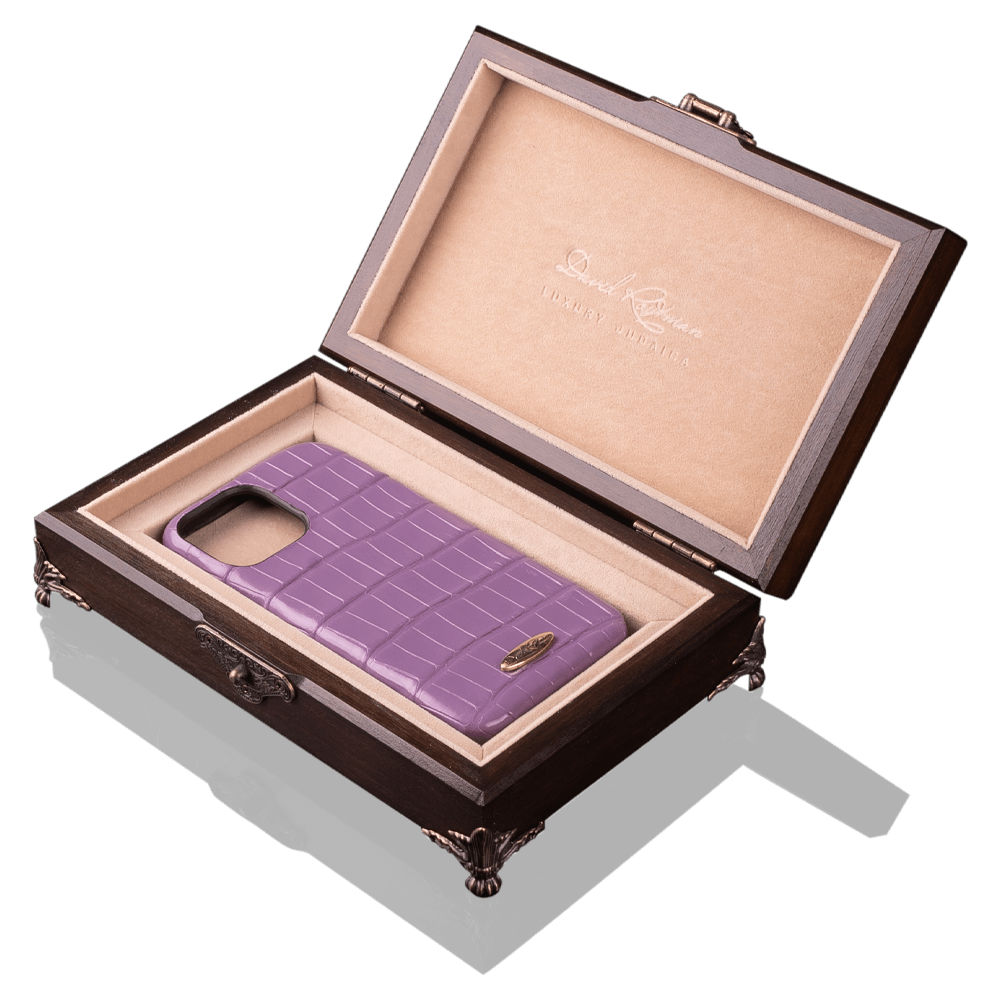 David Roytman Luxury Judaica מציגה בפניכם כיסוי ייחודי לאייפון 16 פרו מקס מעור תנין יסגול בהיר עם לוחות אריות מפליז – תמצית היוקרה, הסגנון והאלגנטיות.