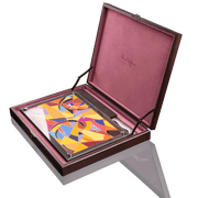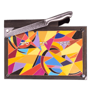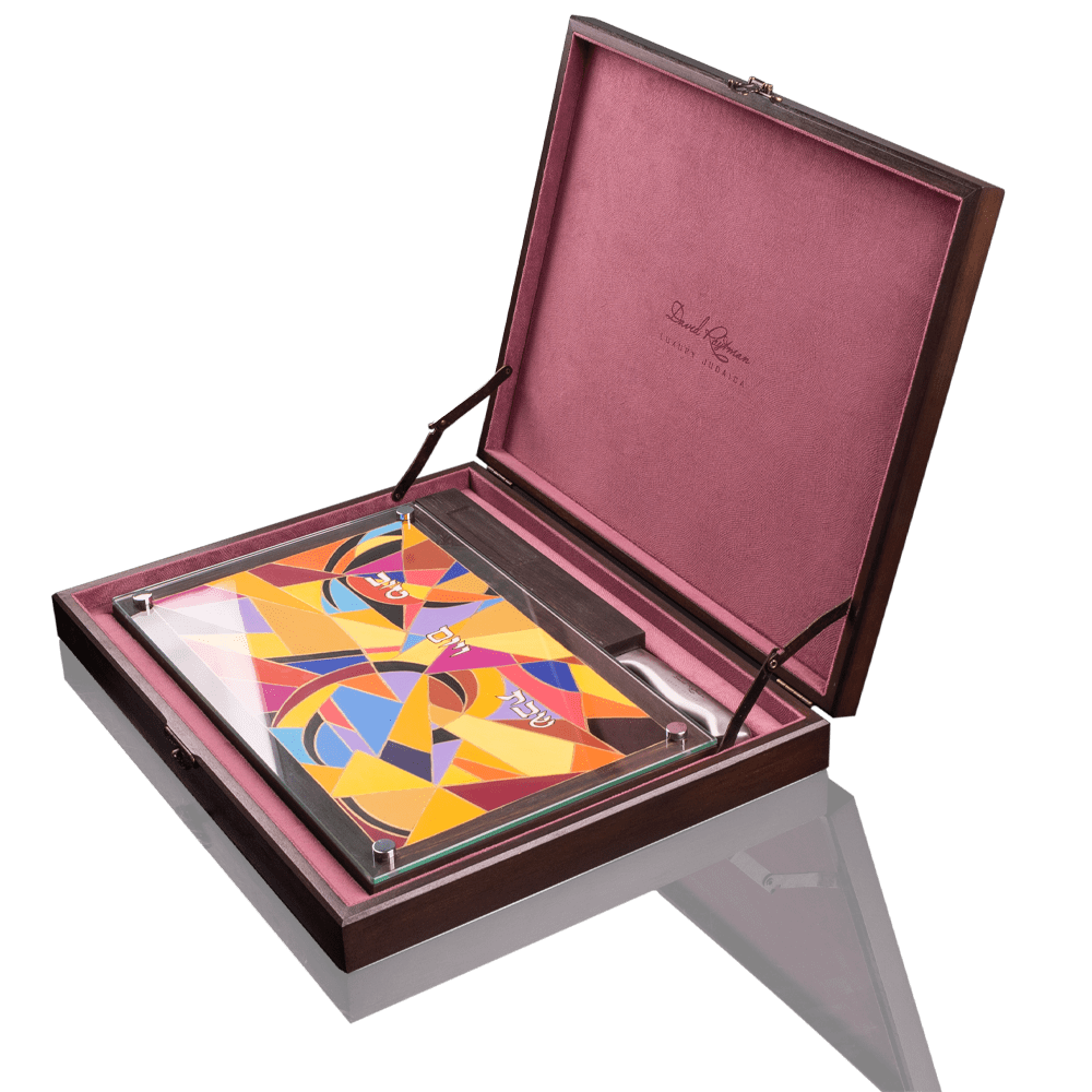 הסט כולל קרש חיתוך לחלה וסכין. העיצוב "אבסטרקציה" משלב דפוסים מודרניים וצבעוניות ייחודית, שנעשו בצבעי אקריליק בעבודת יד על גבי עור איטלקי, מתחת לשכבת זכוכית חזקה.