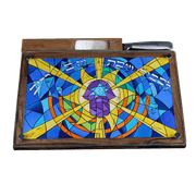 הסט כולל קרש חיתוך לחלה וסכין תואמת. האומנים שילבו עץ מילה כהה ועץ אגוז ליצירת הקרש. מתחת לשכבת זכוכית עמידה משובץ ציור אבסטרקטי המזכיר ויטראז', שצויר ביד בצבעי אקריליק על עור איטלקי טבעי.