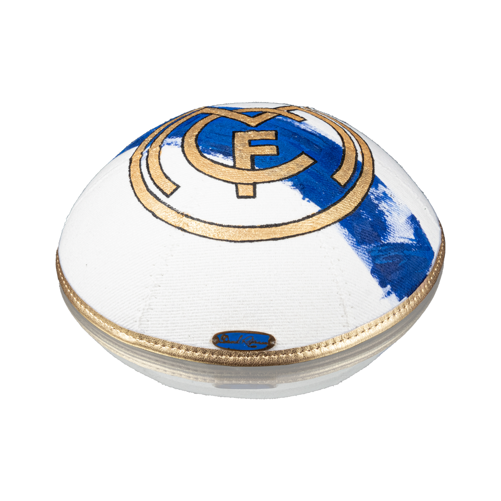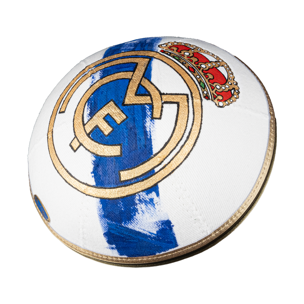 כיפת הג'ינס מקולקציית "770" מבית העיצוב David Roytman Luxury Judaica, עם סמל מועדון הכדורגל ריאל מדריד, היא שילוב ייחודי בין אהבת הספורט לעולם האופנה היוקרתית. הכיפה עשויה מג'ינס איכותי ומעוטרת בסמל המועדון האגדי ריאל מדריד.