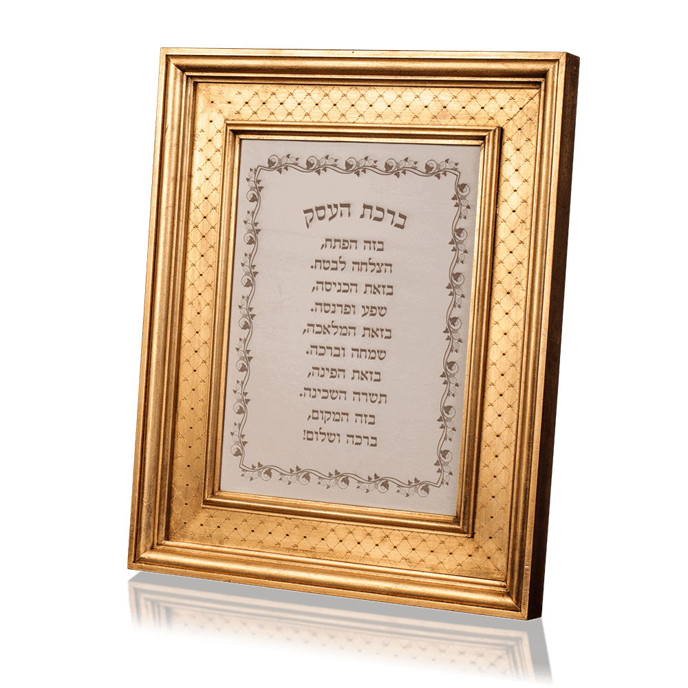 Birkat Habayit is made of genuine Italian leather and hand-painted with acrylic paints. The wooden frame of the blessing is made of a combination of light alder and ash wood. Its light golden glow brings a note of reverence to the piece.