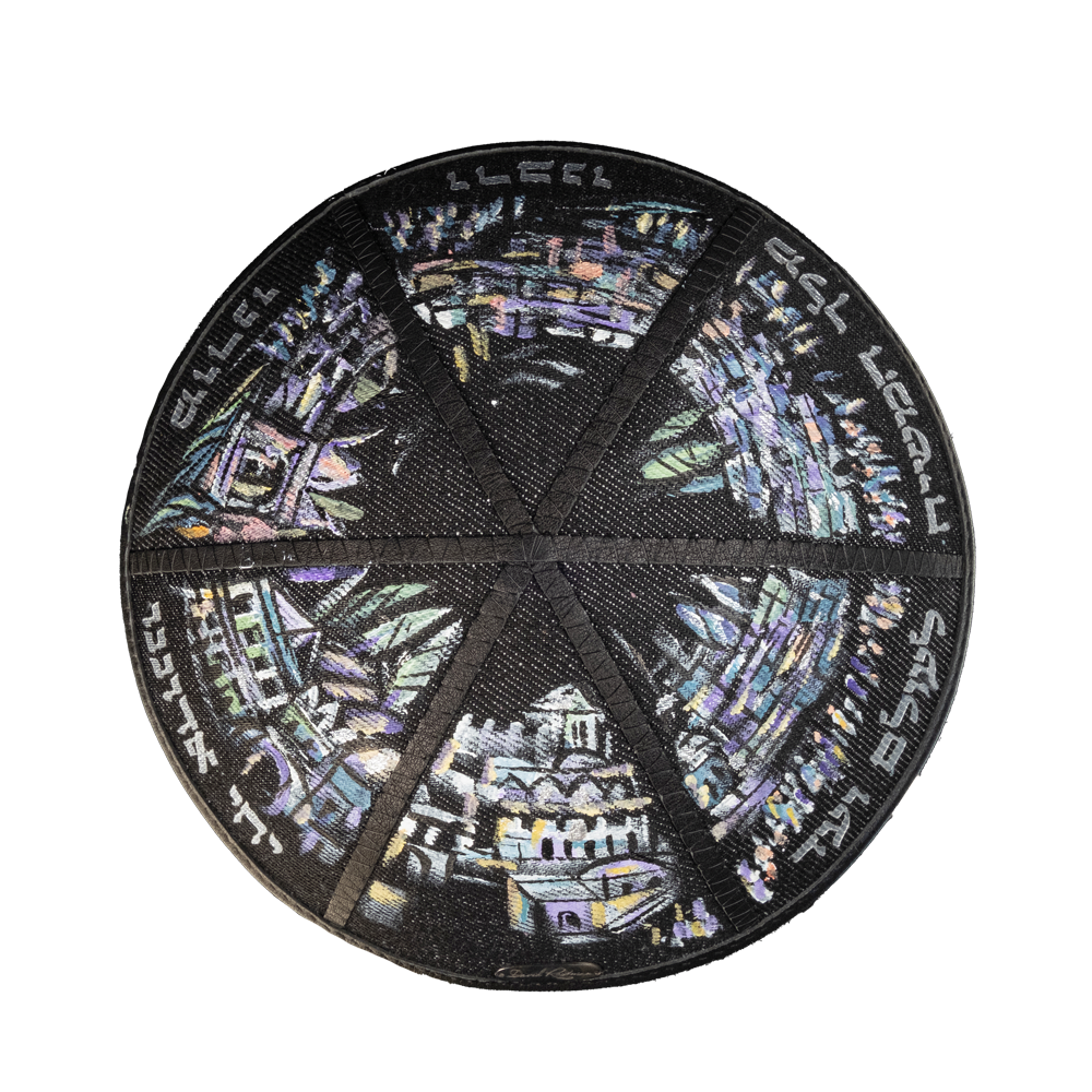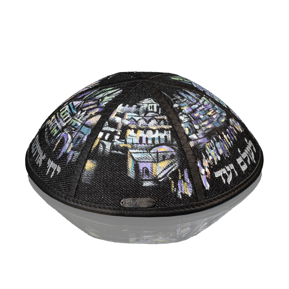 The “770” kippah in denim, hand-painted with acrylics depicting the ancient city of Jerusalem, from the David Roytman Luxury Judaica design house, is a unique headpiece that combines tradition with contemporary style.
