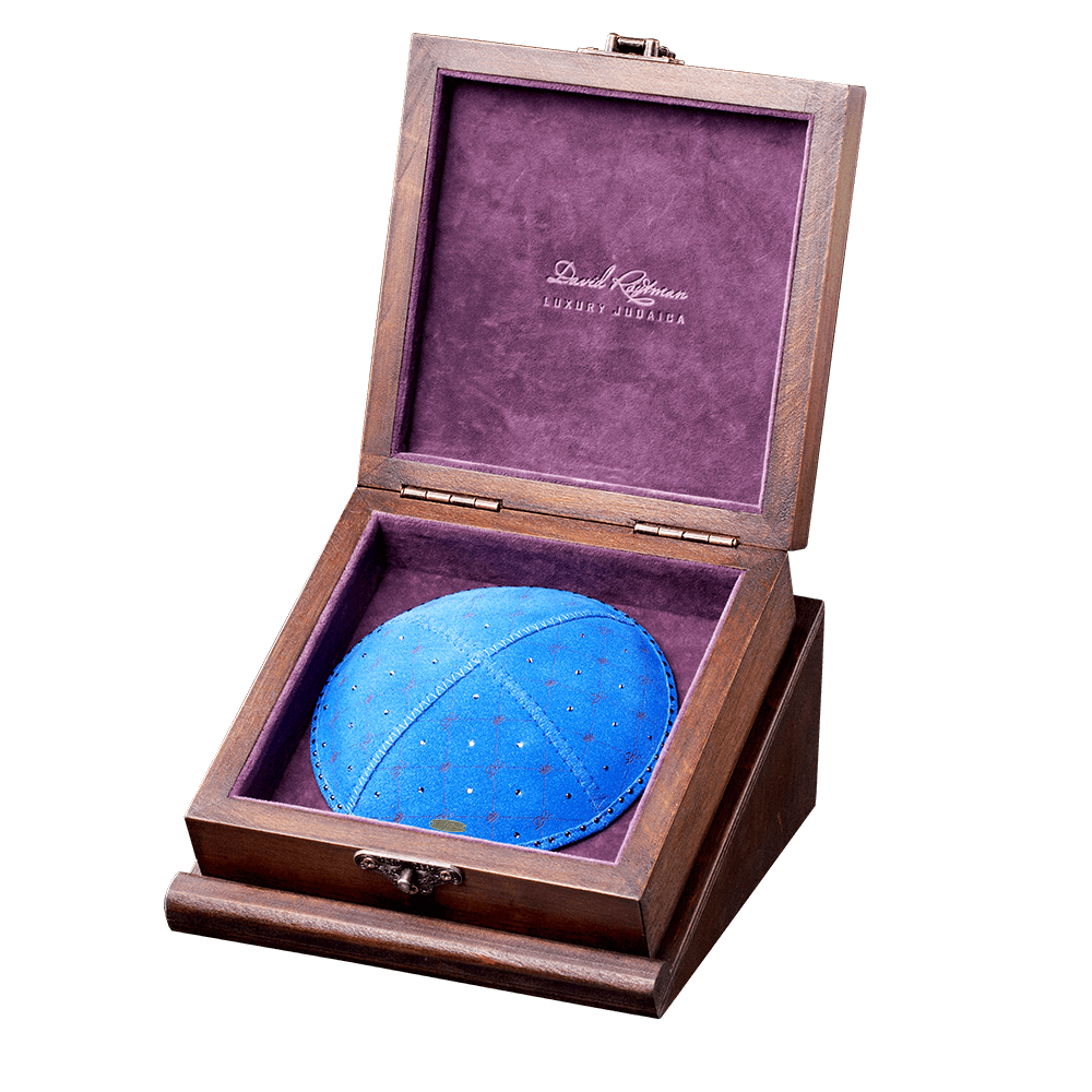 The Baby King David kippah with Swarovski stones from the David Roytman Luxury Judaica design house is an exquisite headdress for the smallest dainty gentlemen. Created using the highest quality materials and finished with vibrant Swarovski stones, this kippah is the perfect combination of style and luxury.