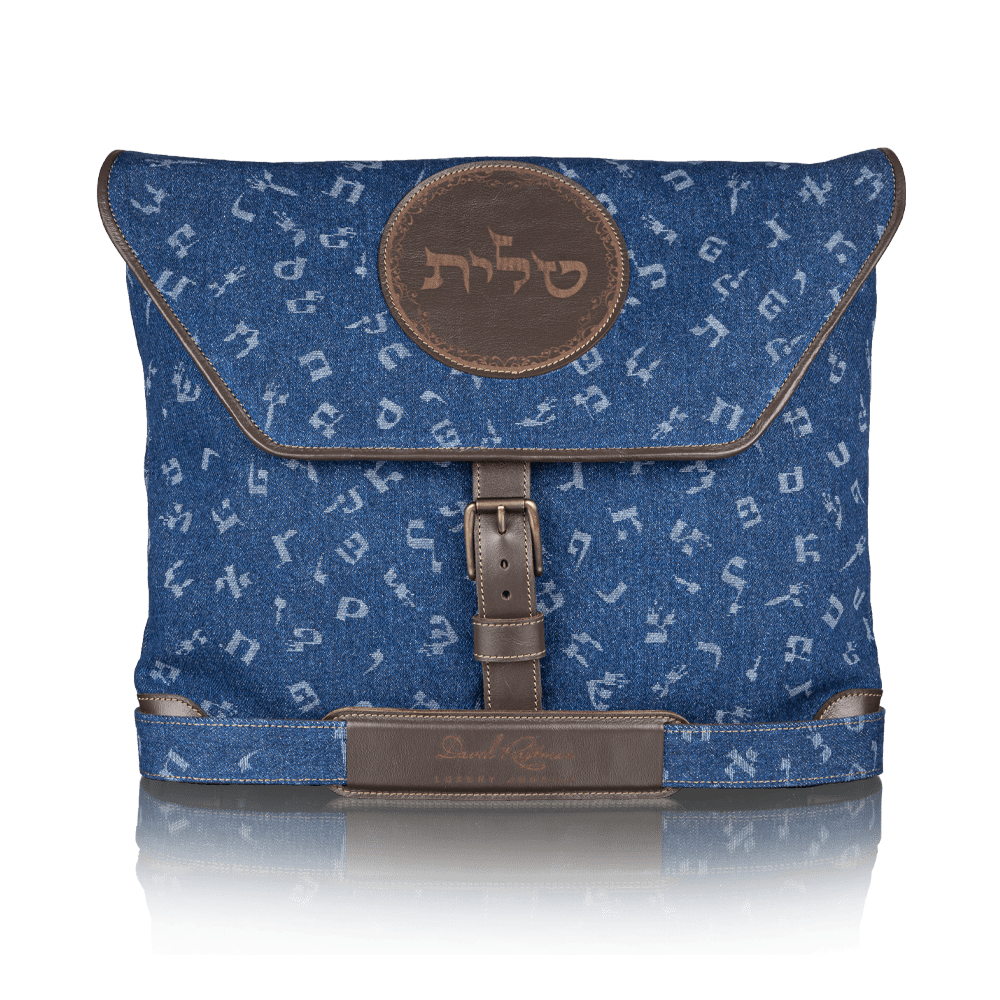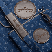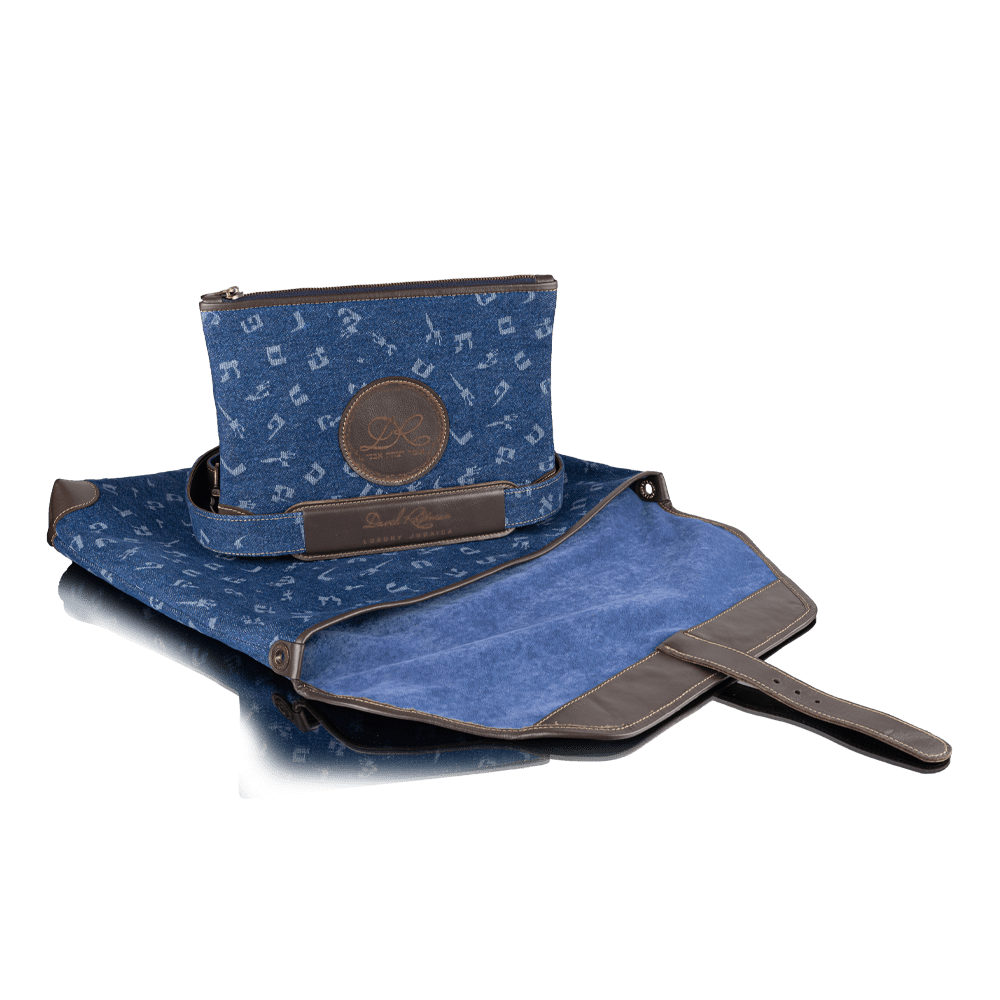 The bag set consists of accessories for the traditional prayer paraphernalia of Jewish men.Tallit is a rectangular coverlet that, in ancient times, Jews wore as a daily garment in the morning and used as a blanket at night. Nowadays, men wear the tallit for morning prayer after marriage. This is an Ashkenazi custom.Tefillin are two small leather boxes containing handwritten passages from the Torah, which are tied around the hands and forehead with straps for prayer. The bags for tallit and tefillin are made of thick denim with Italian genuine leather inserts. The brand's signature pattern is laser-engraved on top of the products.