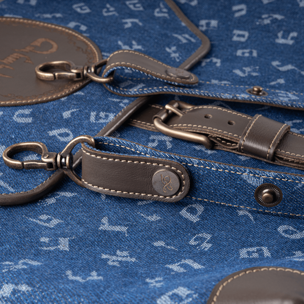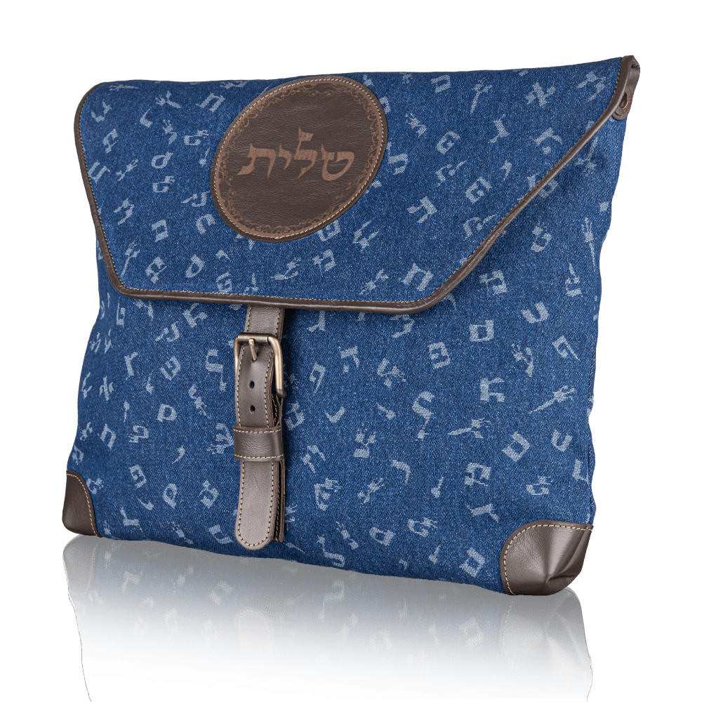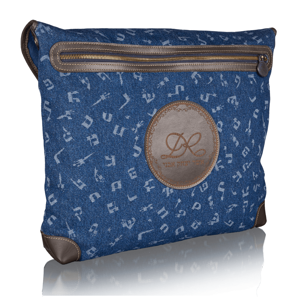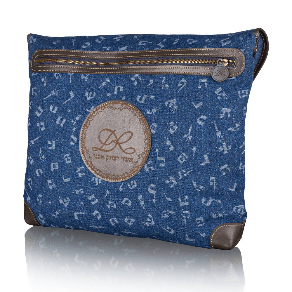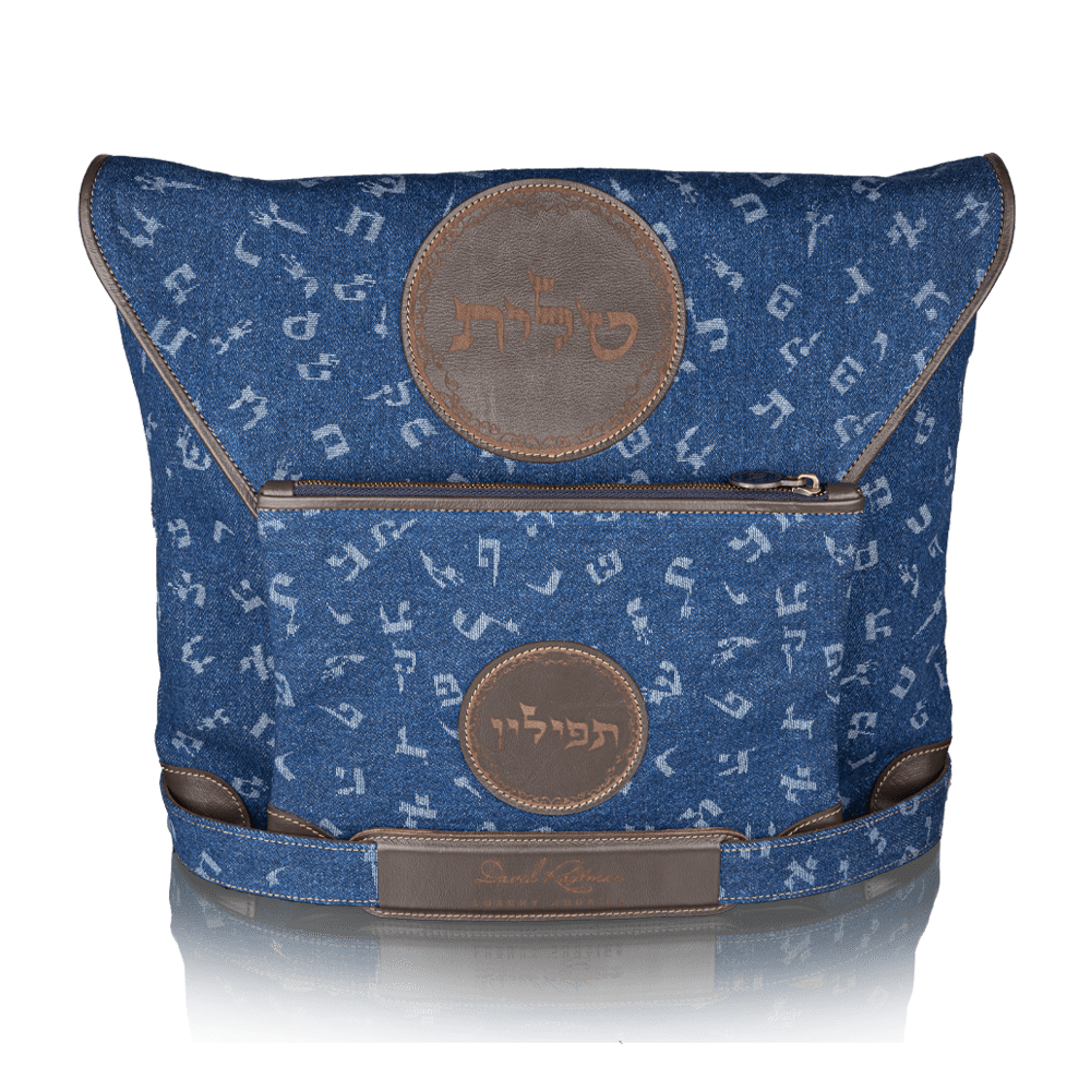 The bag set consists of accessories for the traditional prayer paraphernalia of Jewish men.Tallit is a rectangular coverlet that, in ancient times, Jews wore as a daily garment in the morning and used as a blanket at night. Nowadays, men wear the tallit for morning prayer after marriage. This is an Ashkenazi custom.Tefillin are two small leather boxes containing handwritten passages from the Torah, which are tied around the hands and forehead with straps for prayer. The bags for tallit and tefillin are made of thick denim with Italian genuine leather inserts. The brand's signature pattern is laser-engraved on top of the products.